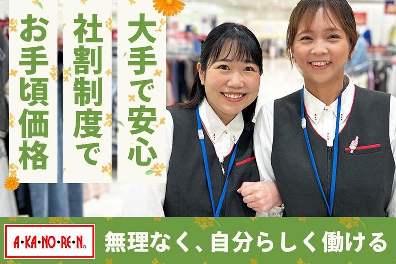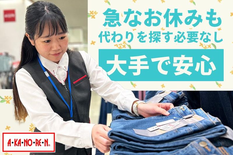 仕事内容 𐄁𐄙𐄁𐄙𐄁𐄙𐄁𐄙𐄁𐄁𐄙𐄁𐄙𐄁𐄙𐄁𐄙𐄁 『久しぶりの仕事復帰で不安…』 『服が好きだし、 アパレルの仕事に挑戦してみたいけど 全く経験や知識がないしなぁ…』 そんな方も諦めないで大丈夫◎ 丁寧な研修・手厚いサポートありで 未経験から始められる、 アパレルの販売STAFFを募集中です♪ 𐄁𐄙𐄁𐄙𐄁𐄙𐄁𐄙𐄁𐄁𐄙𐄁𐄙𐄁𐄙𐄁𐄙𐄁 地元の皆様に愛される衣料品店 「あかのれん」にて、商品の品出しや レジ業務をメインにお任せします♪ 「アパレルショップ=敷居が高い」 というイメージをお持ちかもしれませんが、 当店はご家族連れや年配のお客様が 普段使いされる、とても親しみやすいお店です◎ - 【具体的な業務内容】 ◎商品の品出し・整理 新しい商品を棚に並べたり、 ハンガーに掛けたりします。 ◎レジ業務 お会計の対応をします。 操作は丁寧にお教えします。 ◎簡単な売り場作り マネキンの着せ替えや、 見栄えの良い陳列のお手伝いです。 ◎お客様対応 困っているお客様へのご案内など。 アパレル店によくある、 こちらから積極的にお声掛けする接客は ほとんどありません。 黙々と作業を進めるのが好きな方や、 接客に不慣れな方でも安心して始められます◎ また、重い荷物を運ぶような重労働も少ないため、 年齢を問わず長く続けやすいお仕事です。 - \\魅力POINTをご紹介// ✅未経験から憧れのアパレル勤務♪ 積極的な声掛けや売り込みの必要ナシ。 接客に自信がない方もすぐに馴染めます! ✅ライフスタイルを崩さない働き方 「子供が学校に行っている間だけ」 「夕飯の支度までに帰りたい」 そんな希望を叶える勤務が可能です。 週に18時間程度の勤務を目安に、 あなたの生活に合わせて無理なく シフトを組んでいきましょう♪ ✅幅広い年齢層が活躍する心地よい職場 お客様もファミリー層やシニア層が中心。 同じ目線で会話ができる 穏やかな雰囲気で、 ギスギスした空気はありません。 ✅まずはお試し♪の期間あり◎ 「いきなり長期は不安…」 「職場の雰囲気や仕事内容を知りたい」 という方のために、 実際にお仕事を体験してから決められる 「お試し期間」を設けています!