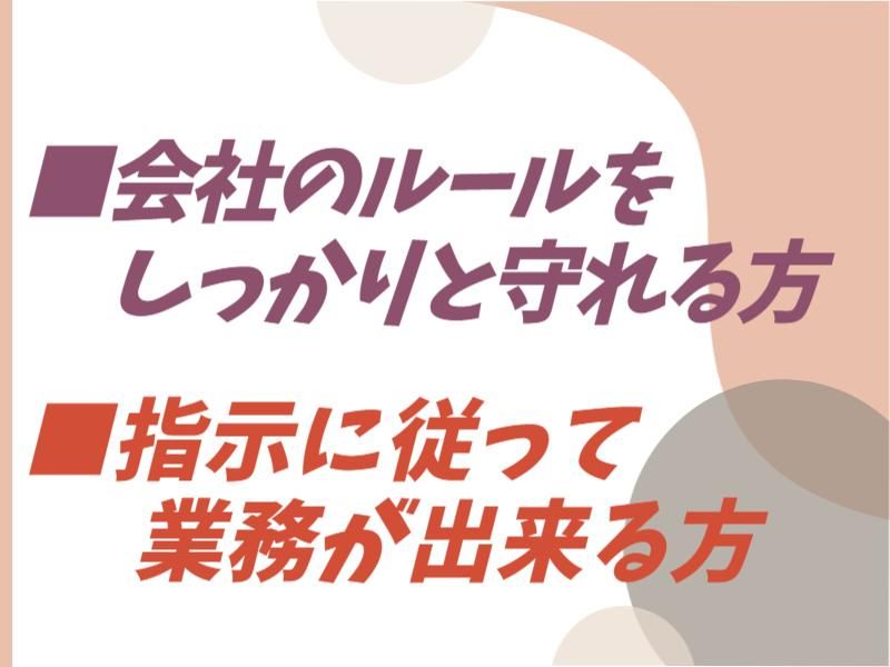 求めている人材 ◎主婦・フリーター活躍中 ◎20代~50代の女性多数活躍中 ◎未経験者大歓迎! ◎扶養内やWワークもOK! ◎日本語でコミュニケーションが取れる方 ◎時間やルールをきちんと守れる方 ◎スピーディーにモクモクとできる方 ◎コミュニケーションが取れる方 ◎会社のルールをしっかり守れる方 ◎指示に従って、業務が出来る方