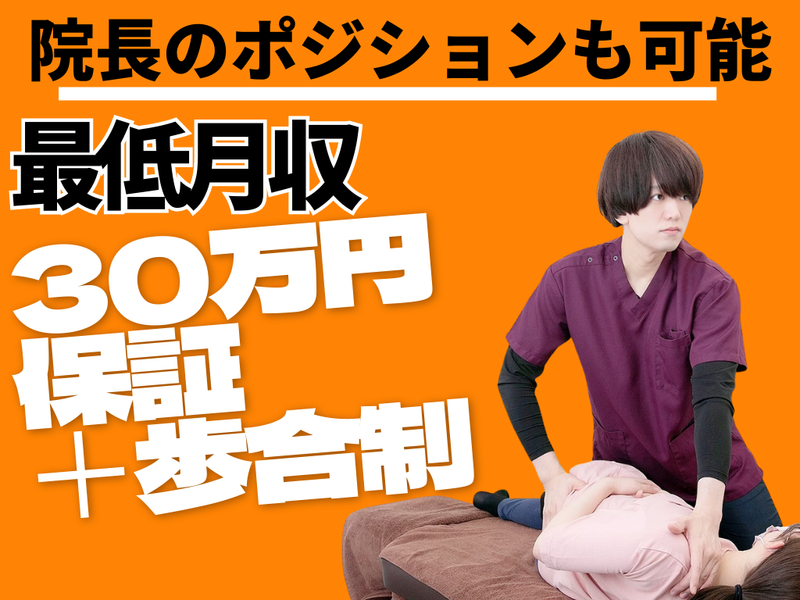 月給300,000円以上 給与詳細 基本給:月給 30万円 〜 【一律手当】 全員に一律で支払われる通勤・皆勤・家族手当金額:なし 全員に一律で支払われるその他手当金額:なし 最低月収30万円保証+歩合制 【給与例】 給与例 【月収例】 入社1年目 柔道整復師の方 月給30万円+歩合=月収42万円 仕事の成果次第で昇給が可能です!