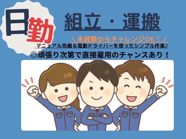 募集要項 職種 真空機器の組立てと運搬 雇用形態 派遣社員 仕事内容 コンプレッサーや真空機器製造工場にて、真空機器の組立てと運搬のお仕事になります。 主に、組立する部品を用意してマニュアルに沿って工具(電ドラ)使用し、組立作業する作業と、完成したら運搬をする作業になります。 ■頑張り次第で直接雇用のチャンスあり <職場環境> ロッカー・休憩室あり 作業着や靴の貸与があり、髪型や髪色自由です。 男女比は6:4
