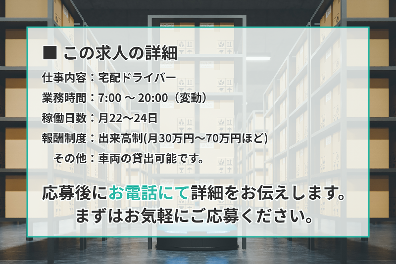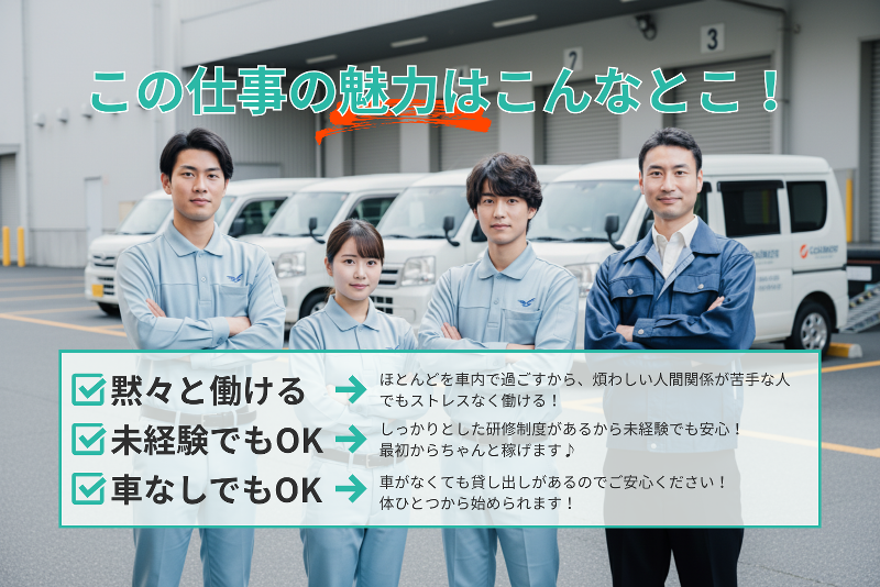 仕事内容: 独自の【最低保証】があり安心して働けるトリガー株式会社で、新しい生活をスタートしませんか? 『キッカケの提供』という私たちの理念を実現するため、弊社ではドライバー様が安心して稼げる制度をご用意しています! 未経験でも安心して飛び込んでください!安定してガッツリ稼げます♪ . 2名様限定の募集!枠が埋まり次第、募集終了となります。 . \求人のおすすめポイント/ ✅安定して稼げる最低保証あり! ✅未経験からでも月60万円可能! ✅高還元率だから高収入が狙える! ✅普通免許・未経験からでもできる! ✅車両リースで手ぶらで始められる! ✅大手企業から安定した物量を確保済み! . \働き方/ ✅黙々と働けて対人ストレスが少ない! ✅固定エリアだから配送効率もアップ! ✅直行直帰で、休憩時間も自分で調整! . \嬉しい制度/ ✅最低保証→初月から安心! ✅先払い→早く現金がほしい方に! ✅研修費負担→研修費用0円! . 《まずはご連絡ください!》 ////////////////////////////// 1. indeedからの応募 本ページの『応募画面へ進む』ボタンからご応募ください。 応募後、弊社からご連絡差し上げます。 . 2. 電話でのお問い合わせ お電話でのお問い合わせも可能です。 『indeedを見た』とお伝えください。 (受付時間:平日9:00−18:00) ////////////////////////////// ※枠が埋まり次第、予告なく終了します。 ご興味のある方はお早めにご連絡ください。 . ーーーーーーーーーーーーーーー . 《先輩の声》 〜ドライバーサクセスへの道〜 ↓ ↓ ↓ 初めまして! 現在、トリガー(株)で応募後のサポートを担当している久保(33歳)です! 約10年前、私も宅配ドライバーとして未経験からこの業界に入りました。ですが、最初に入った会社では色々な苦難もあったのが正直なところです、、、 * 研修や教育が全くない * 稼げない仕事を押し付けられる * 超低い単価で無理やり契約させられる 踏んだり蹴ったりの状態から、私のドライバー人生は始まりました。そして周りを見渡してみると、自分と同じように苦しい状況に立たされているドライバーさんは意外と多いんだということを知りました。 「なんとかこの状況から抜け出したい」 そんな風に思っていたある日、トリガー(株)に出会いました。 様々な企業が『ドライバーファースト(ドライバーを優先すること)』を掲げる中、 この会社は『ドライバーサクセス(ドライバーに成功をもたらすこと)』を理念に掲げており、 1人1人のサクセス実現に本気で向き合ってくれました。 私自身、踏んだり蹴ったりの苦しい状況から救い出してもらいましたし、 だからこそ今度は私が誰かにそのバトンを渡したいと考えて日々この業界と向き合っています。 最低保証制度や先払い制度など、ドライバーとして嬉しい制度をご用意していることはもちろん、 あなた自身の今後のキャリアや生活についても、本気で向き合ってくれる環境がここにはあります。 ぜひ、私たちと一緒に、新しい未来をつくりませんか? あなたの人生が少しだけ良くなるキッカケになれたら幸いです。 ご応募、お待ちしております。 . 《まずはご連絡ください!》 ////////////////////////////// 1. indeedからの応募 本ページの『応募画面へ進む』ボタンからご応募ください。 応募後、弊社からご連絡差し上げます。 . 2. 電話でのお問い合わせ お電話でのお問い合わせも可能です。 『indeedを見た』とお伝えください。 (受付時間:平日9:00−18:00) ////////////////////////////// ※枠が埋まり次第、予告なく終了します。 ご興味のある方はお早めにご連絡ください。 . ーーーーーーーーーーーーーーー . 〈具体的な仕事内容〉 軽バン(軽自動車)にて、個人宅や企業に荷物をお届けする配達ドライバーのお仕事です。固定エリアを回っていただくので、慣れてきたら配送効率をグンッとあげることができます! 大手企業から安定した物量を確保済みなので、安心して働けます♪黙々と働けるから、煩わしい人間関係が苦手な方にもオススメ! . 配送地域:佐賀県 佐賀市、その周辺エリア(直行直帰) 運ぶモノ:日用品 業務時間:8:00-21:00(変動) 休日休暇:日曜、月曜(変動) . \宅配アプリで初心者も安心!/ スマホ1台があれば、あとは荷物を運ぶだけ! アプリのマップにピンが立つから迷わず配送ができます。 また、最適化されたルートに沿って運ぶことで無駄な時間をカットできます♪ 「未経験から宅配を始めたい」「効率よく稼ぎたい」という方にピッタリ! . 〈1日の流れ〉 配属先の拠点(センター)へ直行 ↓ 積荷 担当エリアの荷物を車両へ積み込みます。 ↓ お届け先に配送 宅配アプリのナビゲーションに従って配送します。 ↓ 業務終了! センターにて日報等の提出 ↓ そのまま直帰! . 《報酬について》 出来高制 月40万円程度から最大70万円も狙える! 報酬単価 × 配送数 = 売上 単価が高く、未経験でも稼ぎやすい条件♪ 重量手当、夜間手当など各種手当て多数! . ☆配れば配るほど報酬アップ☆ ・22日稼働:46万円〜55万円 ・26日稼働:56万円〜70万円 . \最低保証制度あり!/ 