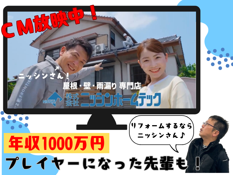 仕事内容 20代で年収700万・リーダー昇格も! 未経験歓迎! 未経験からキャリアを掴むならココ! ✨市場価値を高めて、最速でキャリアアップ!✨ 【ポイント1】 ”高額商材の取り扱い、だからこそ得られるスキル” リフォームというのは、 『人生で最も価値の高い買い物の1つ』です! だからこそ、表面的なコミュニケーション能力 だけでなく、深い信頼を築く力、潜在的な ニーズを引き出すヒアリング力、複雑な要望を 形にする提案力が身に付きます! 【ポイント2】 ”平均月収の高さ=市場価値の証明” 20代~30代の社員が2/3を占めるにも関わらず、 平均月収が40万~50万と高いのは、それだけ 価値のある仕事をしている裏付けです! 【ポイント3】 ”家の状態は千差万別、変化する商材” 築年月、材質、大きさ、様々な異なる条件の 家に対して最適な提案を行う為には、相応の 知識や経験が必要になってきます。 その知識や経験を培う環境がニッシンには ございます! ◆ どんなスキルが身につく? ◆ お客様の人生に寄り添う、コンサルティング営業です。 高額なリフォーム商材を通して、課題解決スキルや 信頼関係を築く力が身につきます。 お客様の大切な住まいを守り、価値を高める提案です。 ✅屋根・外壁塗装 ✅内装リフォーム ✅水回り設備の交換 など お客様の未来を一緒に描き、感謝される仕事です。 ~~~ 1日の流れ(例) ~~~ 08:00 / 出社・朝礼 (車両準備・ロープレ) ▼ 08:45 / 担当エリアへ出発! チームで効率的に動く。 ▼ 09:30 / 工事着工のお客様宅へ訪問 ▼ 10:00 / 営業活動開始 ▼ 12:00 / 昼食(しっかり休憩!) ▼ 13:00 / 午後の営業開始! 見積提出・商談 ▼ 14:30 / 休憩 ▼ 16:30 / 工事終了のお客様訪問 ▼ 17:00 / 帰社・休憩 ▼ 17:30 / 書類作成、事務処理など ▼ 19:00 / 退社 ※頑張り次第で定時より早く退社し、 プライベートも充実! ※残業はインセンティブでしっかり還元します。 ⭐明確なキャリアステップで成長を実感⭐ 一般社員からスタートし、成果次第で スピーディーに昇格! 【キャリアパス例】 ▼メンバー:まずはプレイヤーとして成果を出す! ▼リーダー:入社2年目~/チームをまとめる存在へ ▼所長代理:入社3年目~/拠点運営のノウハウを学ぶ ▼所長:マネジメント職として経営にも携わる! 実際に未経験入社3年で所長代理になった先輩も在籍中! 【活躍中の先輩インタビュー】 「前職は工場勤務。入社2年目でリーダーに昇格し、 今はチーム目標の達成にやりがいを感じています!」 「高額な商品を扱うからこそ、お客様からの 『ありがとう』の言葉の重みが違います。 大きな自信になりました!」 【その他アピールポイント】 ✅未経験でも安心!先輩が丁寧に指導、 知識は後からでOK! ✅男性育休実績あり! GW・お盆・年末年始も長期休暇! 122日休みだからしっかり休める♪ プライベートも妥協しない! ✅昇給・賞与年2回(実績最大8ヶ月分!) あなたの成果を評価! ✅国内・海外社員旅行! 共に働く仲間との絆も深まる! ✅資格取得支援あり! 会社が全面バックアップ! ✅誕生日祝い・結婚・出産祝い金! 社員を大切にする会社です。 ✅営業トークは先輩の隣で学ぶ! 実践でスキルアップ! ✅20~30代活躍中!未経験から高収入を 実現した先輩多数! 前職関係なし!入社後すぐ年収UPも! ✅家具・家電付社員寮完備! 入社半年間は月2万円で利用可!