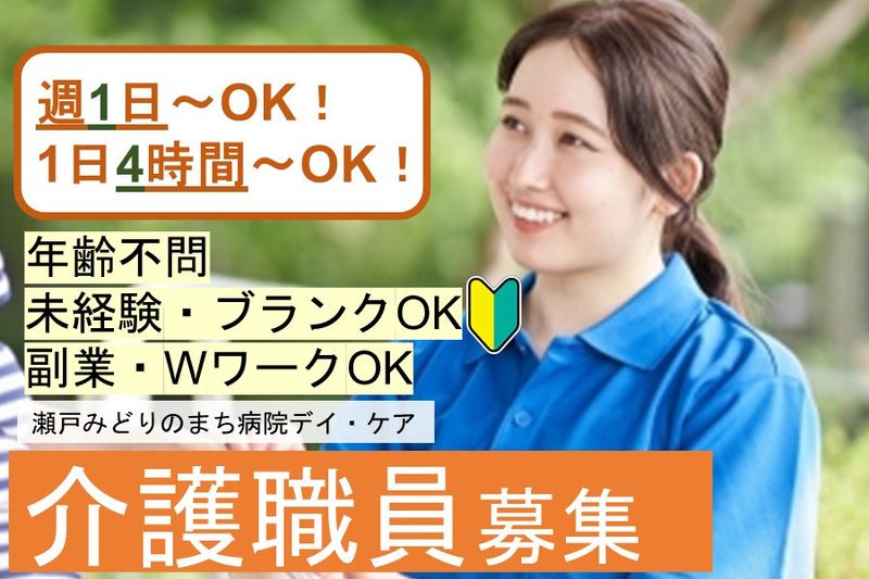【仕事内容】 デイケアで介護職員を募集します! 【アピールポイント】 ・週1日からOK ・1日4時間からOK ・未経験可 ・年齢不問 ・ブランク可 ・副業、WワークOK ■仕事内容 デイケアにおける介護業務全般をお任せします。 ・マシーン誘導 ・食事介助 ・入浴介助 ・排泄介助、オムツ交換 ・移乗介助、補助 ・レクリエーション ・送迎 など 未経験の方も先輩スタッフによる研修制度があるのでご安心ください。 医師や看護師と連携した動きが多く、わからないことは確認しながら業務を覚えて頂ける環境です。 ■瀬戸みどりのまち病院について 当院では医療・介護・在宅の垣根を超えて地域の皆さまの健やかな生活のお手伝いをさせていただくことが使命です。 また、従業員のワークライフバランスも大切にしています。 ■こんな方におすすめ ・家庭と仕事のバランスを重視されている方 ・同じ職場で長く勤めたいと考えている方 ・安定した職場で働きたい方 いきなりで不安な方は見学もお待ちしておりますので、お気軽にご相談ください。 ご連絡・ご応募をお待ちしています。 もっと詳しく知りたい方は、「瀬戸みどりのまち病院」で検索ください! 【求人ID-SM01】