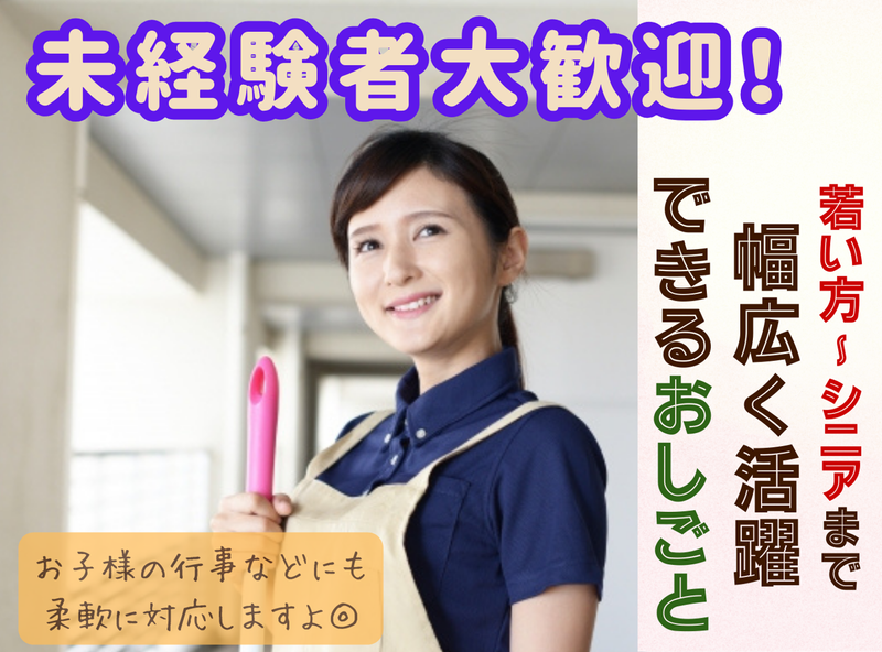 求めている人材 \ 未経験でもスグに活躍! / 学歴不問! 主婦(夫)・フリーターさん大歓迎! 資格や経験も必要ありません! 経験の浅い方はもちろん、 ブランクのある方も歓迎します。 Wワークや副業、扶養内勤務もOK *長期できる方は大歓迎です *主婦(夫)やフリーターなど 20代から30代・40代・50代・60代まで 幅広い世代のスタッフが活躍しています。 「無理なく短時間で働きたい」 「家事の合間で家計の足しに」 「定年退職後のお小遣い稼ぎ」など、 生活スタイルに合わせた勤務可能! 希望の働き方も気軽に相談ください。