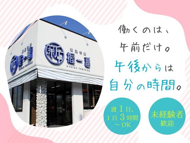 仕事内容 \土日祝は時給アップ✨/ ✅土日祝…時給1190円 ⭐週1日~、1日3時間~OK ⭐バイトデビューもOK◎ ⭐高校生、大学生、主婦(夫)歓迎! 電話でのご応募も歓迎✨  ̄V ̄ ̄ ̄ ̄ ̄ ̄ ̄ ̄ ̄ TEL:0120-003-364 株式会社コムライン/採用担当まで あなたには、 「新握一番 イオン三好店」で ホールのお仕事をお任せします。 ━━━━━━━━━━ 具体的には… ━━━━━━━━━━ ◆レジ ◆セッティング業務 ◆お客様のご案内 ◆ドリンクの提供 ◆店内の清掃 など わからないことはスグに質問できるので、 初めての方も安心してスタートできますよ! まずは簡単なことから始めていきましょう! ━━━━━━━━━━ 初めてのバイトも 新握一番なら安心✨ ━━━━━━━━━━ 年齢不問!資格・経験一切必要なし♪ 大学生・高校生・主婦(夫)さん・ シニアさん・フリーターさんなど、 様々な方が活躍しています。 「経験がないから不安…」 という方もご安心ください! イチから丁寧にフォローしますし、 未経験スタートのスタッフが たくさんいますよ! ━━━━━━━━━━ シフト自由! 融通バッチリです✨ ━━━━━━━━━━ 「平日のみ」「土日のみ」「短時間」 などなど、働き方は気軽に 相談してくださいね♪ テスト・部活・旅行・サークルなどで、 シフトにしばらく入れなくても、 事前に伝えてもらえればOK! あなたのライフスタイルに合わせて シフトを決められますよ。 お試しで3ヶ月の短期も相談OKです。
