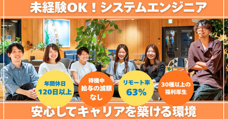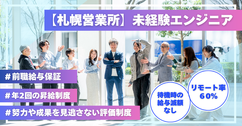 アピールポイント: ■昇給事例 入社1年以内の昇給率100%を実現しており、1度の昇給で月給7万円UP・年間15万円UPの実績もございます。 「報・連・相」や「学ぶ姿勢」、クライアントからの感謝の声など、定性的な面も高く評価する人事評価制度が整っております! ■待機ゼロ × 給与100%保証 毎日膨大な新規案件が寄せられており、興味があれば自社サービスのサポートにも参画可能です! ■チーム参画実績多数 チームで参画するからこそより速い成長に繋がります。 また、すぐに質問できる人が社内にいる安心感は何にも代えがたいです。 安心感をもって共に成長していきましょう。