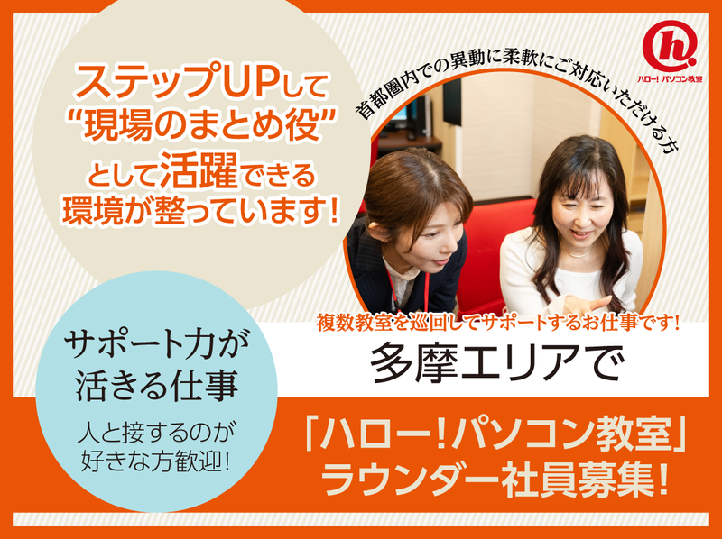 仕事内容 多摩エリアを中心とした近隣の教室へ勤務する、PCインストラクターのお仕事です。 ✅具体的には… ■学習プラン・カリキュラム作成 ■予約・出席・レッスン進捗管理 ■問合せなど電話対応 ■入会案内、教室説明 ■販売促進活動/チラシ配布/SNS投稿 ■教室の管理業務、事務作業 ■試験官 などなど…。 生徒様の指導から、教室の運営まで 幅広くお願いしますが、研修システムが ありますので安心してください! ✅PCスキルに自信がない方もOK 将来的なパソコンスキルを重視して 採用を行っています。 マイクロソフトオフィススペシャリストや マイクロソフト認定資格プログラムなど 資格取得もサポートします! ╭────────────・⭐・・─╮ 首都圏内転勤があるお仕事です! ╰─・・⭐・────────────╯ 拠点における教室運営を中心に、 ゆくゆくはチーム運営や業務推進に関する 役割を担当していただきます。 プロジェクトに応じて、全国各地への 転勤が発生する可能性があります。 もちろん入社後すぐに「いきなり転勤」 ということは基本的にありません。 まずは現在の勤務地で経験を積み、 業務に慣れていただくことからスタートします。 その後、全体の業務の流れや組織の動きが 把握できるようになったタイミングで、 状況やキャリアプランに応じて、勤務地の変更を相談させていただく可能性があります。 転勤のタイミングやエリアについては、 結婚・出産・子育て・介護など、 ご本人のライフスタイルやご事情を十分に 考慮したうえで判断いたしますので、ご安心ください。 ”転勤はキャリアアップのチャンス! ” 全国の拠点に異動することで、多様な経験を積むことが可能! 自分の視野を広げ、キャリアアップやスキルアップにつながります。 ※転勤の場合、家賃補助や 引っ越し費用の手当てがあります✋ ✅初任地は下記教室での勤務です ☕イオンモールむさし村山校 東京都武蔵村山市市榎1丁目1-3 イオンモールむさし村山店1F JR立川駅からバス約25分 ☕イオンモール日の出校 東京都西多摩郡日の出町平井237-3 イオンモール日の出店1F JR五日市線 武蔵引田駅徒歩10分 ☕西友ひばりヶ丘校 東京都西東京市住吉町3丁目9-8 西友ひばりヶ丘店3F 西武池袋線 ひばりヶ丘駅徒歩7分 ゜+.――゜+.――゜+.――゜+.――゜+. <成長のカギはスタッフの努力> 2000年8月の設立以来、全国約190校を展開し、多くの方に選ばれてきたパソコン教室です。 この成長は、最前線で頑張るスタッフ一人ひとりの日々の努力があってこそ。 スタッフの成長が会社の成長に直結しており、その価値はとても大きいです。 私たちは、変化する時代に対応し続けるため、全員が自分の力を最大限に発揮できる職場づくりに力を入れています