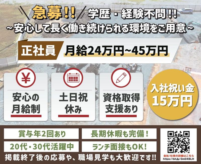 仕事内容 ✅スキルや頑張りによってステップアップ ✅安定の正社員募集!未経験OK! ✅研修制度も充実!昇給・賞与あり お電話応募も大歓迎! 【TEL】0538-45-3313 建物の隙間の量を測る仕事です。 ■専用の機械を使って 建物の隙間の面積を計算する作業が 中心となります。測定機器の使い方は それほど難しくないので、 すぐに慣れていただけます。 気密性能は建物の省エネ性能を 向上させるために重要な項目で、 このお仕事は 人々の暮らしを快適に守ることにつながる、 やりがいのある仕事です。 これまで当社が培ってきたノウハウや知識を、 あなたにしっかりお伝えしていきます。 ■教育体制も充実しています。 まずは先輩に同行し、 気密測定のやり方を覚えていきましょう。 機器の使い方や報告書の作成なども 丁寧にお教えしますので、 未経験の方でもご安心ください。 経験やスキルがなくても大丈夫です! 【アピールポイント】 ✨グラウンド・ワークスは ✨家造りを裏方で支える ✨プロ集団です! ■グラウンド・ワークスは、 地盤、断熱、シロアリ対策など、 家を建てる上で欠かせない 「基礎」の部分をしっかりサポートします。 これらの工程の質が 家の丈夫さや耐久性に大きく影響することを 誰よりも理解しているからこそ、 私たちは仕事に一切の妥協を許しません。 ■現場仕事でも、 汚い・むさ苦しいイメージはありません。 そろいの爽やかなユニフォームを着用し、 現場や道具を常にきれいに保つことを 心がけています。 ■面接前に現場見学を実施します。 見学後に面接に進むかどうかを 判断していただけますので、 まずはお気軽にご応募ください!