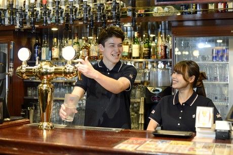 仕事内容 活躍の場は、こんなお店 ビールやフィッシュ&チップスを片手に気軽に仲間と語らいあたったり、スポーツ観戦で盛り上がったり。一人でも大勢でも、自由なひとときを過ごすイギリスのパブ文化を日本で気軽に楽しめる、カジュアルバーです。 具体的なオシゴトは… まずは元気な挨拶から!フードやドリンクはカウンターからのご提供がメインとなります。難しいマニュアルよりも「どうすれば喜んでもらえるか」を大切にする文化です。先輩がイチから教えるので、バイトデビューの方も安心。お店の特性上お客様との会話を楽しみながらの接客となるため、自然とコミュニケーション能力が高まります。 バツグンの待遇で応援 高時給で遊びも充実!従業員割引を使えば、友達とお店をお得に利用することも可能です。テスト期間や帰省など、学生生活に配慮したシフト相談もOK。ここで得た接客スキルは就活での自己PRにも役立ちます。 ◆ストアマネージャー年収例659万円(入社6年目/月給43万7000円+賞与) 教えて!Q&A Q.「スポーツに詳しくないのですが…」 A.「全然大丈夫!働いているうちに自然とルールを覚えますし、詳しくないスタッフも多いですよ(笑)」 Q.「テスト期間は休めますか?」 A.「もちろんです!学業優先でシフトを組めるので、安心して両立してください。」 \働くスタッフの声/ 大学生活を楽しみたくて応募しました。同年代のスタッフが多く、バイト終わりに飲みに行くことも!お客様との会話も楽しくて、気づいたら人見知りが直っていました(笑)ここで働いて本当に良かったです!◆女性スタッフ・Sさん20歳