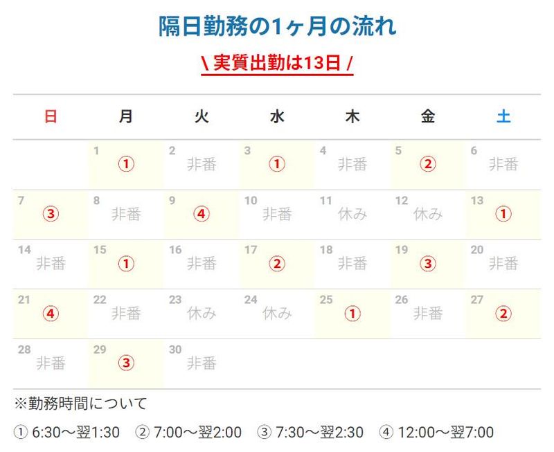 休日休暇 隔日勤務(月15~18日休み) ※日勤勤務(月8日休み/土日)の 土曜出勤で平日休みも可能 ライフスタイルに合わせた働き方を! 【有給休暇】 10日 毎年付与されます