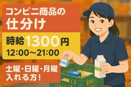 仕事内容 ◆土日月勤務できる方歓迎!安定収入GET! 大手コンビニに並ぶ お菓子・飲料・日用品などの商品を仕分ける作業 です。 ・入荷した商品を種類ごとに仕分け ・配送先店舗ごとに商品を分けて出荷準備 ・バーコードでのチェック作業 重い荷物は少なく、商品は軽いものが多いため男女問わず活躍中! 倉庫内での作業が初めての方も安心して始められます。 【おすすめポイント】 ★午後スタートだから朝はゆっくり♪ 12:00出勤なので、朝の時間を有効活用できます。 ★時給1,300円の高時給! しっかり働いて安定収入を得られます。 ★シンプル作業で未経験でも安心! 商品の仕分けやバーコードチェックが中心なので、すぐに覚えられます。 ★男女ともに活躍中! 扱うのはお菓子や飲料など軽い商品が多いので、体力に自信がなくても大丈夫。 ★土日月勤務できる方歓迎! 安定してシフトに入れるので、しっかり稼ぎたい方にピッタリ。