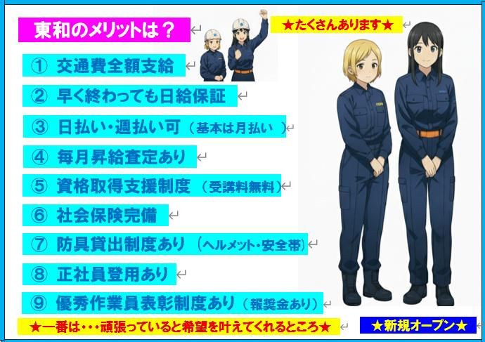 仕事内容 墨出し作業の経験でつちかった あなたの力を貸してください。 あなたのスキル・体力・働き方に 合ったお仕事がたくさんあります。 お任せしたいお仕事は 新築工事や改修工事の現場の お仕事の中で・・・ 具体的に ●躯体現場では・・・ ◇インサートの墨出し・取付作業 ◇各種スリーブの墨出し・取付作業 ◇ボイド加工・段取り など ●内装工事では・・・ ◇機械・器具の地墨出し作業 ◇天井下地軽量への墨出し ◇各種開口部の墨出し作業 ◇ボード開口 など たくさんお任せしたいお仕事が ありますので、ぜひ即戦力で 活躍してください。 もちろんブランクがあり不安な方は 最初は複数人現場をお任せします。 ・本業が空いた時に・・・ ・お金が急に必要な時に・・・ ・次のお仕事が決まるまで・・・ もちろん・・・ ・ガッツリ働きたい方・・・ ・安定して稼ぎたい方・・・ など ぜひ一つでも当てはまったら、 あなたの生活スタイルに合わせて 働けるようにお仕事をご紹介します。 すぐにお電話を 03₋6240‐6102 また経験がなくても・・・ 図面をみることができれば、 優しいリーダーが教えますので すぐに覚えてできようになります。 建設現場が未経験方でも チャレンジしたい方!大歓迎です。 その場合は日給11000円からの スタートになります。 しかし仕事を覚えて慣れてきたら、 現場で働くために必要な資格を 無料で取得して、スキルアップ! 毎月行われる昇給査定で認められると、 日給アップが可能です! YouTubeでは作業内容の動画やスタッフ インタビューをUPしております。 是非ご覧下さい! YouTubeアカウント:@Towa-Corporation - 【4割の方が現場作業員未経験スタート】 ☆難しい仕事はないので、 元気に挨拶ができて、 身体を動かすことが好きな方◎ ☆手に職を付けたい方◎ ☆色々な職種の職人さんと色々な作業を やってみたい方◎ ☆色々な現場に行って働いてみたい方◎ 一緒に働いてみませんか? まずは、あなたのお話を聞かせてください。 問合せだけでも構いません。 【電話】03-6240-6102 まで、ご連絡をお待ちしています。 ************** 【東和で働くメリットを少しだけ】 ●すぐに働いて稼ぎたい方 ↓↓↓ 即面接⇒即お仕事⇒現金日払い可 (最短で面接翌日に勤務可能) ●自分の生活スタイルに合わせて 働きたい方 ↓↓↓ シフト完全自己申告制なので ⇒ 自分の趣味や体力、 本業の空いた時など 週1から勤務可能 ●気楽に働きたい方 ↓↓↓ サポートしてくれるスタッフが あなたの希望を叶えてくれるので ⇒◎急な用事があり明日休みたい ・・午前中までに申告すれば シフト変更してくれます ◎急な出費でお金が必要に ・・前日までのお給与を もらえるようにします 【東和で働く先輩の理由を少しだけ】 ①日払い可 ②シフトが自由 ③気楽だから ※東和のメリットと同じ??? もっとたくさんメリットがあります 続きは面接の時にお話します・・・