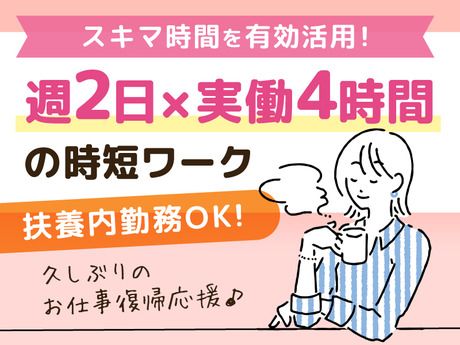 固定時間制 勤務時間 <勤務曜日について> 月~金の間で週2日勤務 勤務いただく曜日は固定となります。 <勤務時間について> 10:00~16:00(実働4時間) 直行直帰OK! 残業ほぼ無し(月1時間程度)