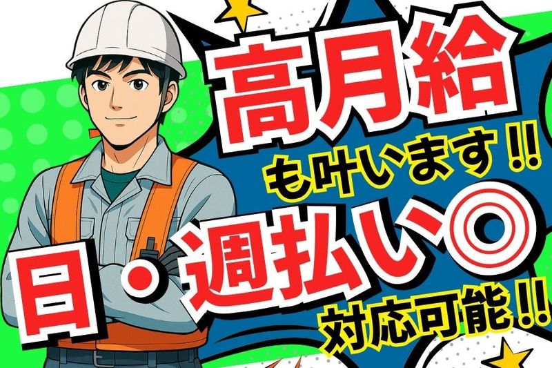【保険制度】 雇用保険、労災保険、健康保険、厚生年金 【加入保険】 ■各種社会保険完備 【福利厚生】 ■交通費支給 ■車通勤OK(駐車場完備) ■バイク・自転車通勤OK ■直行直帰OK ■賞与・昇給あり ■日払い・週払いOK(規定あり) ■通勤手当支給 ■社員旅行あり ■懇親会あり ■制服・ヘルメット・軍手支給 ■髪型・髪色自由 ■髭・ピアスOK ■資格取得支援制度(クレーン・玉掛け・高所作業など会社負担で取得可能) ■寮完備(格安家賃/月1.5万円、光熱費は実費負担) ■仕事体験・職場見学OK ■その他各種手当あり