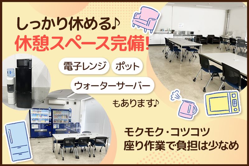 アピールポイント: 【働きやすい環境で新しいお仕事スタート】 \新業務スタートにつきスタッフ募集/ 新しい作業がスタートするため 同時期入社のスタッフも多く安心して始められます。 ~~~~~~~~~~ ◆新業務の立ち上げメンバーとして働けます ・子育てが落ち着いて仕事復帰したい ・家事やプライベートと両立したい ・コツコツ作業が好き そんな方にもおすすめのお仕事です。 ~~~~~~~~~~ 【実際に活躍しているスタッフ】 ■子育てが一段落した方 ■生活費を補いたい方 ■近隣で働きたい方 ■軽作業のお仕事を探している方 未経験からスタートしたスタッフも多数在籍しています。 分からないことがあれば 周りのスタッフがしっかりサポートしますので 安心して働ける環境です。 ~~~~~~~~~~ 【シフトや時間も柔軟に相談可能】 ■週3日~勤務OK ■9時または10時スタート相談可 ■16時/17時/18時退勤など相談可能 ライフスタイルに合わせた働き方が可能です。 短時間勤務や扶養内勤務についても お気軽にご相談ください。 ~~~~~~~~~~ 【その他の待遇】 ■服装・髪色・ネイル自由 ※作業に支障のない範囲 ■スキルに応じて昇給あり 長く働きたい方にもおすすめの環境です。 ========= ▼スタッフインタビュー 《Hさん(学生)》 週3日から働けて10時スタートも相談できるので 学校と両立しやすいと思い応募しました。 作業もシンプルで初めてのアルバイトでも安心でした。 《Kさん(主婦)》 16時や17時に帰れるので 家庭との両立がしやすいです。 座り作業もあり体力的にも無理なく働けています。 《Sさん(フリーター)》 思っていたより体力的な負担が少なく 落ち着いて作業できる環境です。 週5日でしっかり働けて 昇給のチャンスがあるのも嬉しいポイントです。