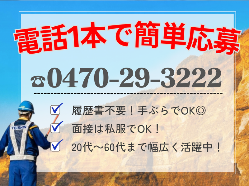 仕事内容 早く終わったら⭐━━━━━━━━━┓ 履歴書不要❗飛び込み面接OK❗ ┗━━━━━━━海にする?山にする? ⚓日払いシステムあり! ⚓早上がりでも日給全額保証 ⚓週2日~OK! ⚓寮完備!即入居可!(入寮規定あり) ⚓移住をしてみたい方も大歓迎! ⚓昼食付♪3日間の事前研修あり◎ ⚓60歳以上のシニアも大歓迎! ⚓気になった方はお電話ください❕❕ TEL:0470-29-3222 ➰︵‿︵‿︵‿︵‿︵‿︵‿︵‿︵‿︵‿︵‿︵‿︵‿︵‿︵‿︵‿︵‿ ➰ <✨履歴書・面接不要の簡易選考あり✨> 入力するだけで合否が分かる! 事前に送付させて頂く、 専用のフォームから質問項目に 回答を入力するだけ! 選考結果は後日担当より ご連絡させて頂きます。 ※質問項目の内容と 事実に相違があった際は、 研修前に不採用となる場合あり 交通誘導スタッフ大募集 ❗❗ (。・ω・)尸━━━━━━━━━━━━━⭐ 道路工事や建設現場などの工事現場や、 各イベント会場にて通行人や 車の誘導・案内をお願いします。 住宅街の現場が中心で交通量も少ないため、 交通誘導が初めての方も安心して働けます。 ☆。゜ ~︶~。。~︶~゜。。~︶~゜。★ ⚓嬉しい♪日払いOK!⚓ 日払いOK!急な出費にもバッチリ対応! 頑張った分の報酬がその場で受け取れます♪ 【⭐早上がりになっても日給全額保証⭐】 基本は1日8時間勤務ですが、現場によって 4~5時間で終わることもあります。 その場合も給与は全額お支払いします❗❗ ⚓研修をしてからのスタートなので安心⚓ 初日からいきなり現場に出る! なんてことは絶対にありません。 現場に出る前に丁寧な研修があるので、 初めての方も安心してスタートできます♪ 先輩も気さくなメンバーが揃っているので、 わからない事はスグに相談可能です ❕ ⚓週2日~OK!働きやすい環境⚓ 自分の予定に合わせた勤務が可能です◎ 「帰省したいから連休が欲しい」 「家庭の用事があるからお休みしたい」 など、お気軽にお問い合せください! ╭━━━━━━━━━━━╮ ⭐房総半島に多数現場あり⭐ ╰━━━━━━━━━━━╯ 房総半島に100ヶ所以上の現場があります! ✋「釣りをしてから出勤したいから 海の近くの現場がいい!」 ✋「徒歩圏内の現場がいい!」 ✋「サイクリングしてから出勤したい!」 など、お気軽にご相談下さい♪