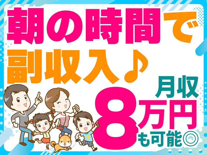 仕事内容 ~接客ほぼナシ♪自分のペースで働ける~ ~早朝勤務のため暑い季節も負担少なめ~ ✅早朝の空き時間にお小遣い稼ぎ♪ ✅慣れてきたら1時間程度で終わることも! ✅3ヶ月短期・長期もOK ✅Wワーク・副業OK ✅自転車・バイクどちらでも配達可能 ✅60歳以上の方も活躍中! <仕事内容> 担当エリアに新聞をお届けするお仕事♪ 配達中は人との接触ほぼナシ! 基本的に1人なので、 自分のペースで黙々と作業できます。 自転車とバイクどちらもOKです! <未経験OK♪気軽に始められる!> ★週1日だけでもOK! スキマ時間に働ける自由シフト◎ ★定年後の新しい習慣にも◎ 運動がてら働きたい方、 ちょっとしたお小遣い稼ぎをしたい方にもピッタリ!