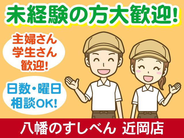 仕事内容 「八幡のすしべん 近岡店」にて パート・アルバイトメンバーを募集中! ━━━ すしべんで働く魅力 ━━━ ◎初心者でも親切丁寧な指導で安心 ◎家計にやさしい食事補助制度あり ◎交通費支給(規定あり) ◎週2日~勤務OK! ◎ご希望の勤務日数・曜日の相談OK ◎朝・日中・夕方から・夜間で時間帯選択OK! ◎Wワーク・副業OK ━━━━━━━━━━━━━━━━━ 【主なお仕事内容】 〇お客様の席へのご案内 〇配膳・食器の片付け 〇レジ業務 〇お弁当・お惣菜コーナーへの品出し陳列 〇簡単な調理補助 など <未経験・ブランクの方も安心の環境> まずは簡単なことから始めていただきます。 難しいお仕事はありません! 一から研修を行います! ひと通りの業務を覚えていただくまで 先輩スタッフがしっかりフォローします。 分からない事があったり、困った時は 気軽に声をかけてください。 飲食店が初めての方 パートタイムで働きたい方 ダブルワーク希望の方 またはバイトデビューの方 久しぶりの仕事復帰の方も歓迎しています! <プライベートと両立して働けます> 週2日~OK!「平日のみ」「土日祝のみ」などもOK! 例えば 〇学生さん=>学校帰りやサークルと両立もしやすい! 〇ダブルワークさん=>土日の週末や休みの日を活用したい! 〇フリーターさん=>空き時間を使って稼ぎたい!など <幅広い年代の方が活躍しています> 20代、30代、40代、50代の方 主婦(夫)さん、学生さん(大学生・短大生・専門学生) フリーターさん、Wワークさん 様々な方が活躍中です。 スタッフ同士の仲が良く、 和気あいあいとした雰囲気が魅力です。 初めての方もすぐに馴染める環境なので、 安心してご応募ください! 一緒に楽しく働きませんか! ご連絡お待ちしております。