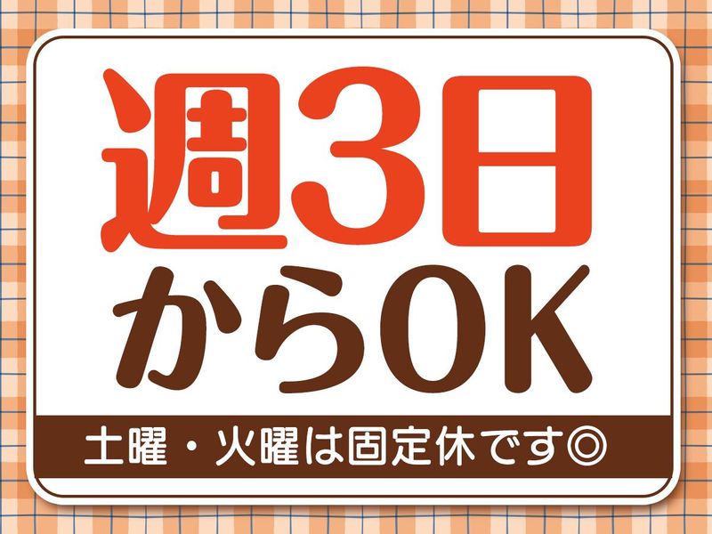 勤務時間詳細 【勤務時間】 9:00~17:00(実働7h/休憩60分) ★週3~5日勤務/シフト制 ★土・火は固定休 ★即日勤務OK ★短期~長期まで歓迎