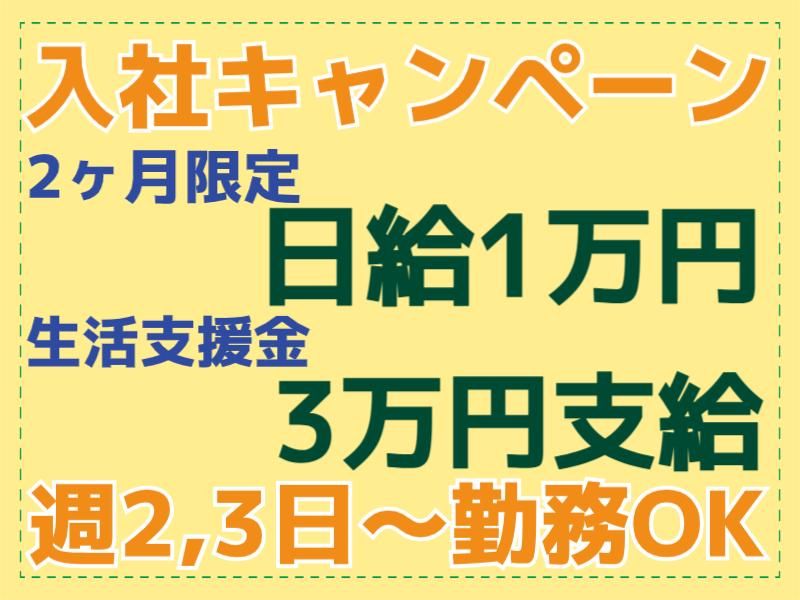 日給10,000円以上 給与詳細 基本給:日給 1万円 〜 固定残業代:なし 【一律手当】 全員に一律で支払われる通勤・皆勤・家族手当金額:なし 全員に一律で支払われるその他手当金額:なし ============= 【入社キャンペーン!】 2ヶ月間限定:日給1万円♪(※規定あり) ============= *仕事の都合上、早上がりになった場合でも1日分の給与は保証します! *週払い相談OK ==▼入社3ヶ月目以降▼== 【日給8,320円~+手当】 <マイカー通勤している方> 令和8年1月~令和8年3月まで 【特別車両手当10,000円/月】支給 ※規定あり ※週4日以上就業できる方のみ ※4月以降は給与規定にのっとって車両手当を支給します ============= ■資格手当あり(所持資格により月5,000円~) ■精勤手当(月25日以上勤務で月2,000円) ■リーダー手当(月1,000円~5,000円) ■送迎手当(他のスタッフを送迎している人/月1,000円~3,000円) ※業務スキルにより昇給あり(規定あり) 【給与例】 給与例 <収入例> ★月収20万円 日給1万円×月20日 ==▼3ヶ月目以降▼== *週2日勤務の場合 【月収6万6560円】 ※日給8320円×8日(4週計算) *週3日勤務の場合 【月収9万9840円】 ※日給8320円×12日(4週計算)