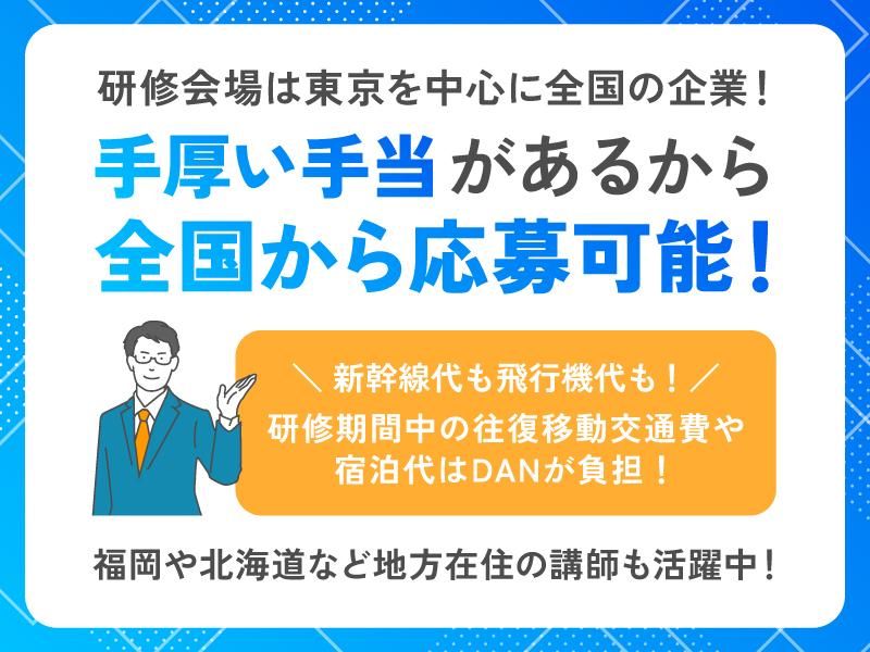 仕事内容 2026年春に開講する 企業の新人向けIT研修において、 メイン講師の講義進行をサポートする サブ講師を募集します。 【必須要件】 下記いずれかの経験1年以上 ■オブジェクト指向言語を使用した システム開発経験 (Java、C#、Pythonなど) ■ネットワークおよび 三層Web基盤構築経験 上記要件を満たす方であれば、 講師未経験でも大歓迎。 エンジニアとしての実務経験を活かし、 IT講師デビューの第一歩を サブ講師からスタートしませんか。 ━━━━━━━━━━━━━ 仕事内容について ━━━━━━━━━━━━━ 講義の進行はメイン講師が担当。 受講者からの質問対応など、 一人ひとりの進捗にあわせた 学習のサポートが サブ講師の仕事です。 受講者に寄り添い、 その成長を後押しする 重要なポジションです。 最初はまだ学生らしさが 抜けていなかった受講者が、 研修最終日には自分の言葉で 堂々とプレゼンを行っている―― そんな「人の成長」を 目の当たりにできる、 大きなやりがいを実感できます。 *** 詳細な仕事内容や 1日のスケジュールについて語る 講師の対談動画も公開中! https://dan-inc.jp/recruit/#interview ━━━━━━━━━━━━━ ステップアップも可能 ━━━━━━━━━━━━━ カリキュラムやクラス進行に 習熟いただいた後、メイン講師へと ステップアップする途も開けています。 また、 基礎レベルの研修ではメイン講師、 高難度レベルの研修ではサブ講師… といった柔軟な働き方も可能です。 下記より詳細をご確認ください。 ▼ https://next.rikunabi.com/company/cmi3814473001/ ━━━━━━━━━━━ 全国から応募可能 ━━━━━━━━━━━ IT研修はクライアント企業の 指定会場で行われることが多く、 首都圏をはじめ大阪、名古屋など 都市部での登壇が中心となります。 宿泊費や赴任・帰任時の 交通費はもちろん、 毎週末・祝日・休講日の 帰省時の交通費もDANが負担。 ※新幹線・飛行機の往復運賃を支給 研修開始前の打ち合わせや 勉強会はオンラインで実施。 地方にお住まいの方も 活躍いただける環境です。 ━━━━━━━━━━━━━ 多様な働き方を実現 ━━━━━━━━━━━━━ サブ講師の日給は4万7300円。 春から夏にかけての 短期間の登壇でも、 毎年まとまった額の収入を 安定して得ることができます。 残りの期間は、 ・受託開発で更に収入アップを目指す ・勉強やインプットに費やす ・主婦業に専念 ・カフェのアルバイト など、みなさんそれぞれの スタイルで過ごしています。 *** ・主婦 × 講師 ・地方在住 × 講師 ・現役エンジニア × 講師 現役講師がそれぞれの働き方について 語るインタビューを公開中! https://dan-inc.jp/recruit/voice/