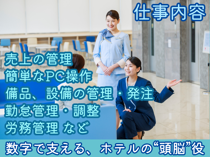 仕事内容 長く続けてきた接客の仕事。 「ありがとう」と言われる瞬間は好きだけど、 立ち仕事やシフト勤務、 将来のことを考えると少し不安——。 そんなあなたの経験を、 今度はホテルを“支える側”で活かしてみませんか? 東横INN敦賀駅前では、 支配人の右腕としてホテル運営をサポートする バックオフィススタッフを募集しています。 【仕事内容】 ✅日報作成、売上分析、会員数チェック ✅小口現金、勤怠、給与処理のサポート ✅備品の在庫確認、業者への発注・調整 ✅フロント補助としてお客様対応 ✅支配人との打ち合わせやシフト調整 お客様対応よりも、 スタッフやホテル全体を支えるお仕事です。 ✨ホテル業界が初めてでも安心 ホテル業界や経理の知識は一切不要。 業務はマニュアル化されており、 支配人や先輩がOJTで丁寧に教えてくれます。 わからないことはすぐに聞ける距離感があり、 未経験からでも安心してスタートできます。 \\\接客経験が活かせるポイント/// 販売や接客の仕事で培ってきた 「気づく力」「段取り力」「コミュニケーション力」 そのすべてが、この仕事の大切なスキルです。 たとえば—— ✅店舗での在庫管理経験 → 備品や消耗品の管理・発注にそのまま活かせます。 ✅チーム連携やお客様対応で培った報連相 → 支配人やフロントとの調整に活きます。 ✅売上管理・伝票確認の経験 → 経費処理や売上日報作成で即戦力に。 つまり、接客での経験がそのまま “ホテルをスムーズに動かす力”になるんです。 \\\この仕事のやりがい/// 直接お客様と関わる機会は少なくても、 「備品がすぐ揃って助かった」 「データを整理してくれてありがとう」 そんな“社内”のありがとうが日々のやりがいになります。 人を支えることが好きな方にこそ、ピッタリのポジションです。