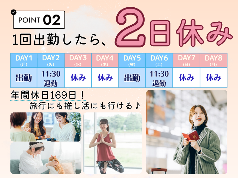 勤務時間詳細 総労働時間:1ヶ月あたり150時間15分 〜 171時間 <勤務時間> 10:30~翌11:30(実働時間20時間45分) (休憩4時間15分※仮眠含む) ~1日の流れの一例~ 10:30 出勤・制服に着替える 11:00 朝礼・引継ぎ・予約数の確認など 15:00 チェックイン対応・フロント対応 24:00 仮眠・休憩 04:00 ロビー設置のアメニティ補充 06:00 朝食会場のお手伝いなど 08:00 チェックアウト対応・引継ぎ 11:30 退勤 <その他> 月1回フロントミーティングあり ▶10:00~16:00(休憩1時間) ※無料で昼食も提供されます。