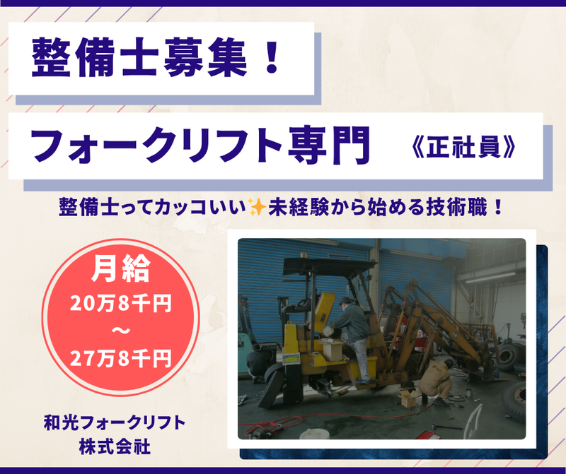 仕事内容 \\\✨アピールポイント✨/// *‥‥*‥‥*‥‥*‥‥*‥‥*‥‥* ⏩産業車両のプロフェッショナル企業! ⏩資格取得支援制度が充実◎ ⏩未経験OK♪手厚いサポート体制! ⏩充実の待遇で安心して働ける⭐ *‥‥*‥‥*‥‥*‥‥*‥‥*‥‥* ✨仕事内容 *‥‥*‥‥*‥‥*‥‥*‥‥*‥‥* 産業車両(主にフォークリフト)の メンテナンスをお任せします◎ ✅定期点検業務 └車両の状態を定期的にチェック ✅法定点検業務 └法令に基づく点検作業を実施 ✅整備業務 └故障箇所の修理・メンテナンス 未経験の方でもフォークリフトの整備に 特化した技術を少しずつ習得いただけます◎ <✨安心ポイント✨> 一つひとつ丁寧に指導いたしますので 未経験の方もご安心ください◎ 産業車両メンテナンスのプロフェッショナル として、確かな技術と知識を身につけながら ステップアップできる環境が整っています⭐ ✨充実の待遇で長期安定◎ *‥‥*‥‥*‥‥*‥‥*‥‥*‥‥* フォークリフト整備に関する 資格取得支援制度をご用意しております◎ もちろん取得費用は会社が負担します! 資格を活かしてフォークリフト整備の スペシャリストとしてスキルUPが可能! 各種資格手当も充実しているので、 長く安定して働ける環境が整っています⭐ ✨1日の流れ *‥‥*‥‥*‥‥*‥‥*‥‥*‥‥* 08:00 出社・朝ミーティング まずは1日の作業スケジュールをチームで確認。 必要な部品や工具をチェックし、準備を整えます。 08:30 午前の業務開始 作業場にてお客様のフォークリフトを点検・整備。 内容によっては、お客様の会社に出向いて作業を行うこともあります。 12:00 昼食 昼食はしっかり1時間。ゆっくり休んで午後に備えます。 13:00 業務開始 午後も引き続き点検や修理作業。 丁寧かつ確実な仕上げを意識して取り組みます。 16:30 整備記録書の作成 1日を通して行った整備内容を整備記録書にまとめ、上司に報告。 次回の作業やお客様への対応にも役立ちます。 17:30 退社 工具を整理し、翌日の準備をして退社。 仕事とプライベートのバランスも大切にしながら働ける職場です。 お疲れさまでした! ✨会社について *‥‥*‥‥*‥‥*‥‥*‥‥*‥‥* 産業車両(フォークリフト等)の 販売・修理・点検や、長期・短期のレンタル 及び一部物流機器等の販売を手がける当社◎ 住友ナコフォークリフト販売(株)の特約店 として、産業車両のメンテナンスの プロフェッショナル集団を目指しています! 物流を支えるフォークリフト業界は、 今後も社会的ニーズが高まり続ける分野です。 だからこそ、安定した需要が見込め、 長期的にキャリアを築いていけるこの業界で 一緒に成長していきましょう!
