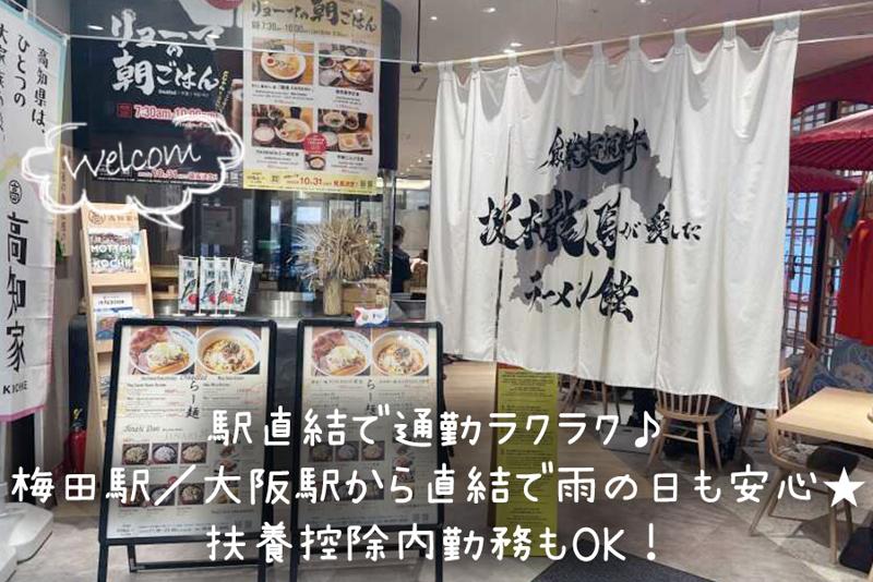 アピールポイント: ≪超レア!第二期オープニング募集!!≫ オープニング当初から働いていた レギュラースタッフの卒業に伴い 今回は久しぶりに【STAFF大募集】! みんな同時スタートだから安心◎ この機会に新しい仲間の輪を広げましょう! 1.シフトの融通が利く!  ̄ ̄ ̄ ̄ ̄ ̄ ̄ ̄ ̄ ̄ ̄ ̄ 4時間など短時間勤務もOKだから予定も立てやすい! ・実家への帰省や家族旅行 ・試験勉強や就活 ・お子さんの急な体調不良 など、生活に合わせて柔軟に調整できます! 2.駅直結で通勤ラクラク!  ̄ ̄ ̄ ̄ ̄ ̄ ̄ ̄ ̄ ̄ ̄ ̄ ̄ 梅田駅/大阪駅から直結! 雨の日でも濡れずに通勤できて安心。 毎月通う場所だから、立地の良さは大切です! 3.絶品まかない付き!  ̄ ̄ ̄ ̄ ̄ ̄ ̄ ̄ ̄ ̄ ̄ 坂本龍馬が愛したラーメン食堂の味を 【無料】で楽しめます! 人気店「人類みな麺類」と「おともや」が コラボした特別メニュー! スタッフに大好評のまかないです! 4.清潔感のあるキレイな店内!  ̄ ̄ ̄ ̄ ̄ ̄ ̄ ̄ ̄ ̄ ̄ ̄ ̄ ̄ ̄ 店内は常に清掃が行き届いており、 気持ちよく働ける清潔な空間。 飲食店が初めての方や、 衛生面が気になる方も安心です◎