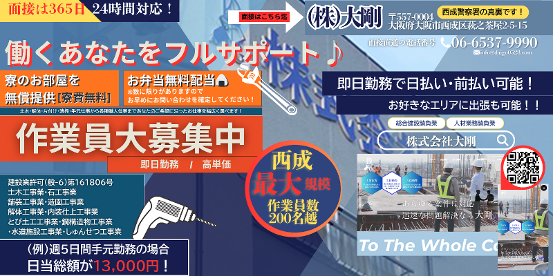 アピールポイント: ✅完全日払い,翌日実働も可能。スピード感のある働きを実現できます! 翌日から働けて、その場で給料も受け取りが可能。 さらに固定残業代も支給します。 あなたの働きやすい環境を実現できるのは大剛だけ♫ ✅福利厚生が充実♪ ⇨どんな制度があるかはまずはお問い合わせして聞いてください。 ✅成長企業であるからこそ、自分を活かせる 建設業界において凄まじいスピードで成長をしている大剛だからこそ、 あなたの実現したい働きを応援できます。 公式HP:(https://daigo0528.com/) 関連会社; ・株式会社解剛(https://kaigo-0528.com/) ・ゲンバくん株式会社(https://gojokaiguide.com/) ・株式会社Daigou