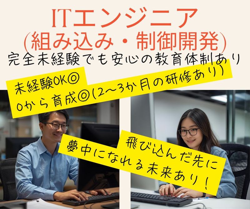仕事内容 モノづくりの根幹を担うITエンジニアとして 製品が“動く仕組み”や“電気の通り道”を ゼロから学べます 【具体的な仕事内容】 ◎製品の動きをつかさどる <組み込み・制御ソフトウェア開発>など モノづくりの根幹を担うエンジニア業務に 携わっていただきます ◎扱う製品は、自動車関連部品・検査機器・ FA機器・生産設備など 多岐に渡り、モノづくりの最前線を支えます 【具体的な業務内容】 ◆組み込み・制御開発 └ C、C++、C#、Simulink、VHDL、 Verilogなどを用いた 制御ソフト・組み込みソフト開発 └ 設計~実装・テスト・運用まで 一貫して携われます 在籍メンバーの多くが実務未経験からのスタート。 飲食業や営業、スポーツインストラクター、SE、 アニメ業界など、幅広い異業種出身者が活躍しており、 経験者も大活躍中! 女性管理職も在籍しています。 ※社員の平均年齢30代 お仕事番号/Cok2683-000