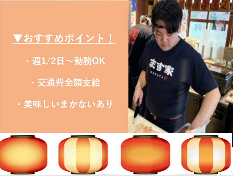 仕事内容 ▼△▼△▼△▼△▼△▼△▼△▼△▼△ ✨駅チカの人気レトロ居酒屋✨ ます家 広島駅前 荒神町店 焼き豚・おでんが美味しいと大人気 新しい仲間を大募集!! ▼△▼△▼△▼△▼△▼△▼△▼△▼△ ╭━━━━━━━━━╮ ✤ 店舗について ✤ ╰━v━━━━━━━╯ ●ます家 広島駅前 荒神町店 アクセス:「広島駅」から徒歩4分 住所:広島市南区荒神町3-16 - ╭━━━━━━━━━╮ ✤ メイン業務 ✤ ╰━v━━━━━━━╯ ・仕込み ・簡単な調理 ・盛り付け ・洗い場 …などをお願いします。 包丁を握ったことがなくても大丈夫! 未経験や初めてのバイトをする方も大歓迎! - ╭━━━━━━━━━━━━╮ ✤ シフト・時給について ✤ ╰━v━━━━━━━━━━╯ ✅平日 17:00~24:00 ✅土日祝 15:00~24:00 ✅全日 9:00~(仕込みのみ) ✅カープ戦の日(デイゲーム) 12:00~24:00 ・週1.2日~OK ・1日4時間~OK シフト提出は週毎で予定が組みやすい◎ 希望シフトはご相談下さい。 ✅たくさんシフトに入れる方 ・週4日以上 ・1日8時間勤務 ・時給1300円 (深夜時給1625円) ✅スキマ時間で働ける方 ・週1.2日以上 ・1日4時間~勤務OK ・時給1150円~(深夜時給1438円) ✅主婦・主夫の方必見✨ ・開店前の9時~仕込み作業をお任せ! ・お肉をカットして串に刺すなど、 簡単な作業ばかりです♪ ・平日のみ土日のみOK(時給1150円) ✅フリーター・学生の方必見✨ ・22~24時で締め作業をお任せ! ・店内の清掃や調理器具などの片付け ・週1日~OK◎ ・時給25%UP(深夜割増)で高時給♪ (時給1438円~1625円) ※22時以降は時給25%UP! ※バイトリーダーは月1万円手当あり ※大入り手当+300円 - ========= ⧉ オススメPOINT ========= 店内は懐かしの大衆酒場のような 賑やかで楽しく明るい雰囲気! レトロで居心地の良い居酒屋です。 女性も男性もご家族連れのお客様も 気軽に飲んで笑って楽しんでいるお店です♪ ✅プライベートに合わせた働き方を 「学校やサークル終わりに」 「Wワークで週2日だけ…」 「テスト期間でこの週は勤務が厳しい」 「いやいや、もっとシフト入りたい」 など事前にご相談ください! 無理なくシフトを組めるように調整します。 ✅キレイで清潔な店内! 3月OPENの店舗で清潔!キレイ! 気持ちよくスタートできます。 毎日の清掃もしっかりして キレイを継続していきましょう。 新しい仲間たちと気楽に楽しく 働けること間違いナシ! ✅美味しい賄いあり 「食費などが浮いてホント助かる~」と 一人暮らしの学生から大好評です♪ - ========= ⧉ 応募について ========= 面接は私服でOK◎ いつも通りのあなたとお会いしたいです。 当日、体調不良や急な用事で やむを得ずキャンセルになる場合は 改めて日程調整はできますので 遠慮なくご連絡くださいね♪ お友達との応募もOKです! // ◆役者、俳優、モデル、声優を目指している ◆留学資金を貯めている ◆将来的には独立したい ◆いつか自分のお店を持ちたい…など 夢に向かって頑張っている人を応援! \\ フルタイムでしっかり稼ぎながら お休みも取れる環境が整っています - ╭━━━━━━━━━╮ ✤ 私たちについて ✤ ╰━v━━━━━━━╯ 《株式会社フロンティアワン》は 東京都内に20店舗以上を展開しており 北海道や広島、埼玉など様々なエリアで 飲食店を運営する安定した会社です! - ▼△ アクセス ▼△ ・「広島駅」から徒歩4分 ・「猿猴橋町駅」から徒歩3分 ・「的場町駅」から徒歩6分 ・「稲荷町駅」から徒歩10分 ・「段原一丁目駅」から徒歩10分 ※交通費全額支給 ※自転車通勤OK