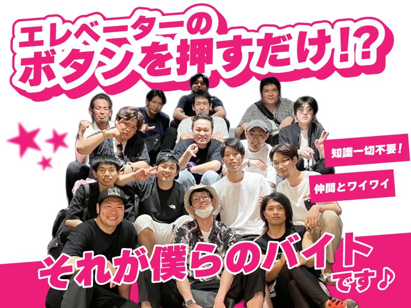 仕事内容: / エレベーターのボタンを押すだけ☆ \ [1]現場に到着したら、まずは挨拶! 元気よく先輩に自己紹介をしましょう♪ [2]作業内容の流れとやり方を先輩と確認! 初めは分からなくても大丈夫★ 先輩が優しく教えてくれます♪ [3]実際に作業を開始! ボタンを押して現場の作業員さんを 各階に送迎するだけ☆ 難しい知識も一切不要です! ★☆★☆お仕事はこれだけ★☆★☆ 必要な知識・技術・経験はありません! やる気があればどなたでも可能です☆彡 もちろん初心者さんでもがっつり稼げます◎ ご不明点は面接時に聞いてください☆