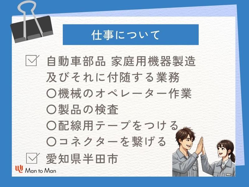 仕事内容: 【職種】 (時給1700円)自動車部品の製造 【仕事内容】 【 お任せするお仕事 】 自動車部品あるいは家庭用機器製造 及びそれに付随する業務 〇機械のオペレーター作業 〇製品の検査 〇配線用テープをつける 〇コネクターを繋げる ーーーーーーーーーーーーーーーーーー 社会経験浅くたってここで活躍できる!! 未経験でもここで活躍できる!! 馴染みやすい環境だからとっても安心!! 工場見学をしてから決めるでOK!! \ 今だけ!限定特典 / ☆彡・。.・゜゜・。.・彡☆ ✅定着支援金支給  ̄ ̄ ̄ ̄ ̄ ̄ ̄ ̄ ̄ 3ヶ月毎に5万円支給!! ☆彡・。.・゜゜・。.・彡☆ お気軽にお問合せ下さい(^▽^)/