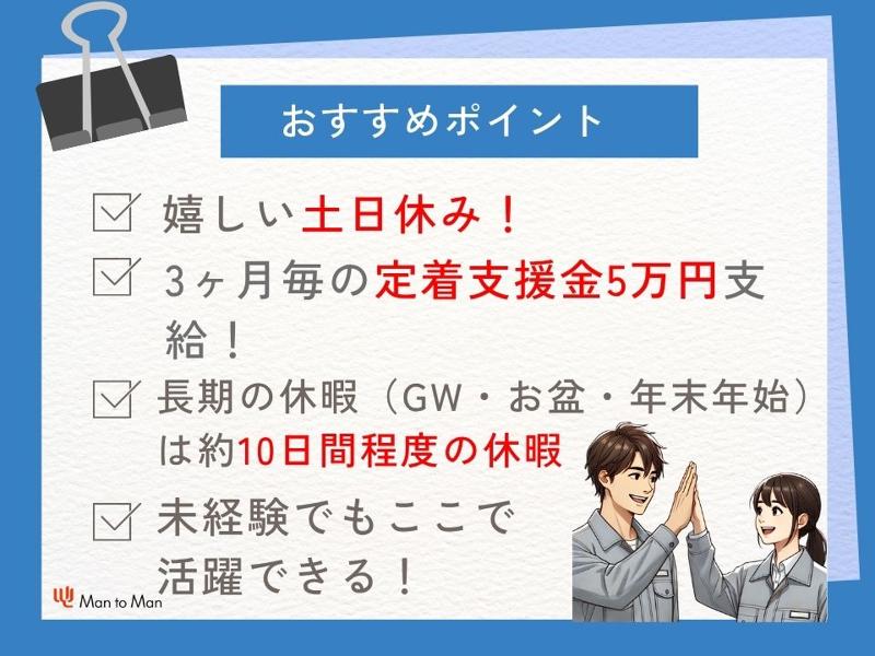 【保険制度】 雇用保険、労災保険、健康保険、厚生年金 待遇・福利厚生: 【加入保険】 健康保険,厚生年金,雇用保険,労災保険 【待遇】 〇3ヶ月毎の定着支援金5万円支給 〇研修あり 〇ロッカー/休憩室あり 〇作業着・制服貸与:あり(無償) / 皆様にとって、長く働きたいと 思える環境を作ります! \ 【 福 利 厚 生 】 1 退職金 (3年以上Man to Manに在籍した方) 2 給料前払い制度 (月3回・最大60,000円まで) 3 有給休暇 (入社半年後に10日間付与) 4 家族手当 (扶養するお子様対象) ※1名に対し、月5000円支給 5 産休・育休取得制度 6 介護休業 7 定期健康診断(1回/年) 8共済会制度(1,000円/月 ※任意) 例 <慶弔一時金> <出生祝金> ・第1子10,000円 ・第2子20,000円 ・第3子以降30,000円 <就学祝金> ・小中高で各10,000円 <結婚祝金> 20,000円 <傷害疾病の入院もしくは通院> ・2,000〜4,000円/日 <福利厚生サービス> 「ベネフィット・ステーション」が利用可能 ・レジャーやフィットネスショップなど、 幅広く利用できる会員制割引サービスと なります。 【喫煙環境】 敷地内禁煙
