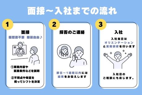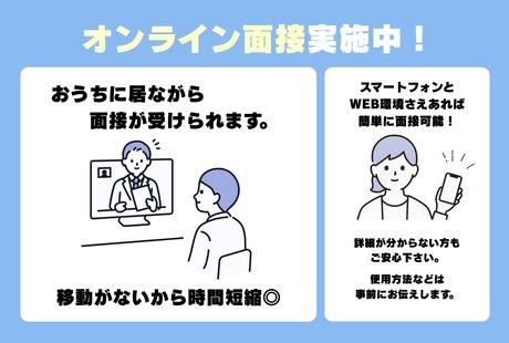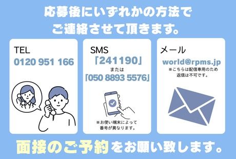 選考プロセス [面接] 面接会:履歴書不要、服装自由で参加OK (1)全体説明(約30分) 業務内容や就業条件などを説明 (2)個別面談(約10分) 不明点や希望を伺ってシフトを決定 [採否連絡] 即日~1週間以内にはお伝えします! [入社] 入社日当日はオリエンテーションと研修を行います。 ・入社書類のご提出 ・契約の締結 ・倉庫内で安全に就業頂くための説明会 ・実務研修 ※面接、入社日はご相談に応じます。 【オンライン面談実施中】 スマートフォンとWEB環境さえあれば 自宅から簡単に面接可能! ZOOMという無料アプリを使用して面接を実施♪ ダウンロード方法や使用方法等は 事前にお伝えいたしますので 詳細が分からない方もご安心下さい。 【問合せ先について】 問合せ先:0120-951-166 応募方法 応募後に下記いずれかの方法で 面接日調整のご連絡させて頂きます。 TEL 「0120 951 166」 Mail「world@rpms.jp」 SMS「241190」または「05088935576」