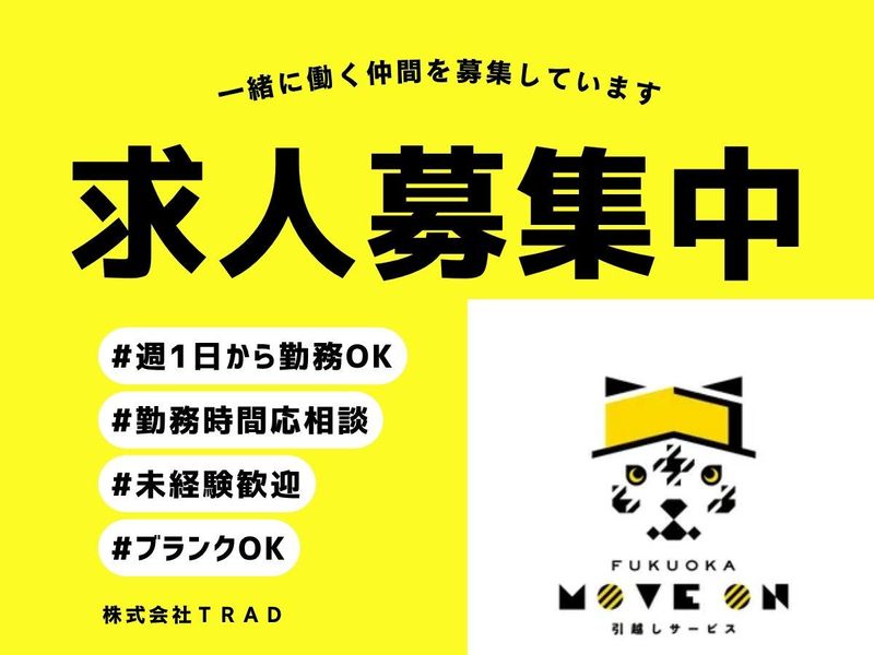 仕事内容 \\求人のPOINT// ┈┈┈┈┈┈┈┈┈┈┈┈┈ ✨ 時給1,100円〜スタート ✨ 未経験スタート9割/研修あり ✨ 週1日〜OK!シフト相談可 ✨ 1現場2〜4名のチーム制で安心 ✨ 力仕事は分担制で負担少なめ ✨ 長期勤務歓迎 ✨ 正社員登用あり アルバイトから安定勤務も目指せる ✨ 短期勤務も相談OK ┈┈┈┈┈┈┈┈┈┈┈┈┈ 【仕事内容】 北九州エリアを中心に、 九州全域で引越しサービス を展開しております。 主に福岡市/北九州市 熊本県一部その他 山口県/広島県など 引越し作業スタッフとして 以下の業務をお任せします。 ▼具体的な業務内容▼ ✅ 家具・家電・段ボール などの搬出・搬入 ✅ 荷物の梱包 積み込み・積み降ろし ✅ 引越し先での設置補助 ✅ 簡単な接客対応 (必要な場合のみ) ✅段ボールの配達など ※重い家具は先輩が メインで対応します。 ※最初は 「運ぶ補助・段ボール整理」 など軽作業中心です。 【1日の流れ(例)】 07:00〜08:00 出社・打合せ ※出社・当日の確認 (現場により前後あり) ↓ 08:00〜09:00 現場へ移動・作業(1件目) ↓ ↓複数の現場で対応(2〜4件) ↓合間にコンビニ寄ったり♪ ↓昼食したり♪ ↓ 16:00〜18:00 帰社&片付け・解散 ※午前中で終わる日もあります ※短時間現場を複数回る日もあります 【担当エリア】 ・北九州&福岡市までの県北エリア中心 ・九州全域 (一部:熊本県/山口県/広島県など) 【入社後の流れ】 ┈┈┈┈┈┈┈┈┈┈┈┈ ⏩ 先輩スタッフと一緒に現場へ ⏩ 梱包・運搬の補助作業からスタート ⏩ 少しずつ作業を覚えていけばOK 未経験の方でも 無理なく慣れていける環境です。 【この仕事のやりがい】 ┈┈┈┈┈┈┈┈┈┈┈┈ ✅ チームでやり切る 達成感がある ✅ 体を動かしながら 健康的に働ける ✅ お客様から直接 「ありがとう」をもらえる ✅ 未経験から 現場経験を積める ✅ アルバイトから 正社員を目指せる ✅ 安定して長く働ける 環境づくりを進めている ★弊社のホームページ★ https://www.trad-fukuoka.com/ サービス内容やお客様の声など 記載していますので要チェック◎