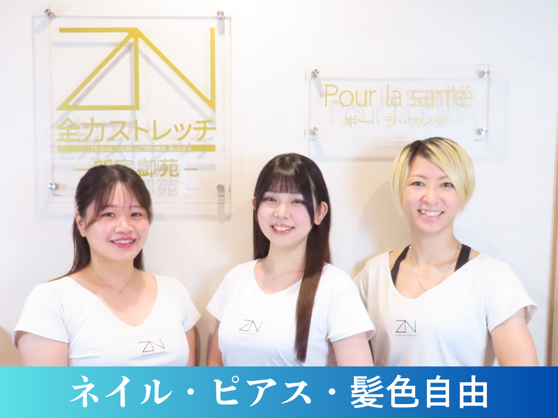 仕事内容 ~全国70店舗展開「全力ストレッチ」~ ~私生活も輝かせるメリットがたくさん!~ ◆未経験からでも年収500~700万円可能です!◆ 年収例:入社1年スタッフ 基本給360万+指名料108万(月30名)+賞与20万=506万 ✨髪型・ヘアカラー・ネイル・ピアスOK! ✨残業はほぼなし&駅チカ! ✨しっかり稼げる!指名料100%還元 ✨ZSTA協会認定トレーナーの資格の取得可能&費用は当社で負担 ========== <仕事内容> 体幹や姿勢矯正に特化したストレッチで、お客様の体の根本改善をサポートする美容トレーナーのお仕事です。 ・お客様の体の悩みをヒアリング ・接客対応 ・ストレッチ施術(マッサージ・骨盤矯正・体幹軸調整・ストレッチ) ・その他事務業務(SNS投稿、パソコン業務) 【1日の仕事の流れ】 1.お客様受付 2.カウンセリング&プラン提案 3.施術スタート 4.アフターフォロー 5.次回予約手続き 6・お会計・お見送り ※お客様の人数:1日で3~5名(完全予約制) フェスやライブなどでアーティスト・スタッフと帯同して施術をすることもあります。 自分も体を動かすので、お仕事をしながら運動不足解消・体力アップ・シェイプアップなどができます。 ========== 【おしゃべりが大好きな方大歓迎】 新宿御苑店には、現在5名のトレーナーが在籍。 上下関係がなく、気軽に話せるアットホームな雰囲気な職場です。 ご来店されるお客様は様々なバックグラウンドを持っております。 どんな方ともすぐに打ち解けられるコミュニケーション能力をお持ちの方、大歓迎! お客様との会話を楽しみながら、リラックスした雰囲気で施術を提供していただける方をお待ちしております。 現在活躍中のスタッフは20代から30代が多く、 その9割が整体、フィットネス、ストレッチの未経験からスタートしています。 ========== 【施術スキルに自信がない…という方でも安心】 現在活躍しているトレーナーのほとんどが未経験からのスタート。 研修制度が充実しており、経験豊富な講師があなたの疑問に親身に寄り添い、一人ひとりに合わせて丁寧に指導します。 安心してプロの美姿勢調整トレーナーを目指せるよう、全力で成長をサポートします! <研修ステップ> ●本店での技術研修 まずは本店のベテラントレーナーから、施術の基礎をじっくり学びます。 ●配属店舗での実践研修 店舗でさらに実践的な研修を重ね、デビューに向けて準備をします。 ●いよいよデビュー! 研修合格後、いよいよお客様の前に立ち、プロのトレーナーとして活躍できます。 さらに、就業後も定期的に研修を行っています。 これは、より技術を磨き、リピート率を上げたいトレーナーを積極的に支援するためです。 お客様に長く愛されるトレーナーを目指せる環境が整っています。 <資格取得もサポート> 通常10万円以上かかるZSTA協会認定トレーナー資格が無料で取得可能! 6ヶ月勤務し、規定をクリアすれば資格が認定され、ディプロマ(資格認定証)が発行されます。 ========== <SNSはコチラ> もっと知りたい!と思ったら… 職場の雰囲気やスタッフの紹介などの詳細は動画をチェック! 実際に働くイメージが膨らみますよ★ ◆Instagramアカウント:@zenryokustretch.shinjukugyoen