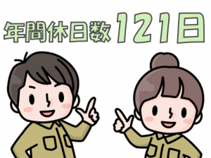 勤務時間 8:15~17:20 ・休憩65分 ・実働8時間 【1日のスケジュール】 8:05 出勤 8:10 ラジオ体操(任意) 8:15~10:15 作業 10:15~10:25 休憩 10:25~12:25 作業 12:25~13:10 昼休み 13:10~15:10 作業 15:10~15:20 休憩 15:20~17:20 作業 17:20~17:25 休憩 17:25~ 作業 ◇作業途中に休憩があるので 体力的にも安心です◎ ◇任意のラジオ体操が意外と人気! 朝から体を動かすと健康面でも気分もUPします♪