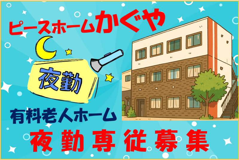 仕事内容 名古屋市南区の「ピースホームかぐや」にて夜間介護のお仕事をお任せします。 夜間は介護士2名、看護師1名で利用者さまの安全を見守ります。 働く介護士さんも、夜間に看護師さんが常駐しているため、利用者さんの状態変化や急変時も安心して働けます。 心配しながら仕事することはありません! 【具体的なお仕事】 ✅利用者様の介護 (起床/就寝・排泄・食事介助など) ✅お食事の提供 (早番との協力提供) ✅夜間巡視 ✅介護記録、ヒヤリハットの記入 その他、付随する業務をお願いします。 *休憩は120分となります。 食事の補助として、 1食150円で食べることができます。 意外と皆さんに喜ばれてます。
