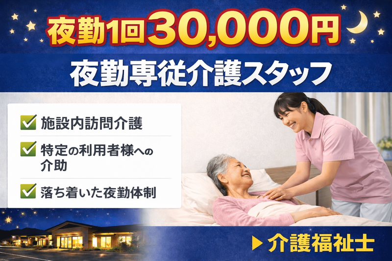 求めている人材 本求人は介護福祉士を対象としています。 実務者研修・初任者研修の研修修了の方もご相談ください。 ✅資格 介護福祉士の国家資格をお持ちの方 ✅週1回~2回、働くことができる方 年齢の条件と理由:あり(例外事由2号・18歳以上(労働基準法) (夜勤による深夜勤務があるため)