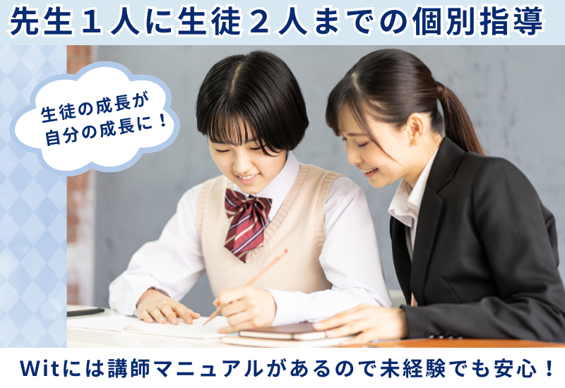 仕事内容 \ 2025年11月に開校した学習塾!オープニング講師大募集 / ピカピカの新教室を、一緒に盛り上げていきませんか? 【お仕事内容】 ■ 個別指導Wit 瑞江校での講師(小学生〜高校生を対象) 生徒一人ひとりにしっかり寄り添う「完全個別指導スタイル」の授業です。 授業は1コマ90分(授業80分+準備・報告10分)。 小学生は国語・算数、中学生は英語・数学が中心! あなたの得意な科目を活かして教えられます♪ 【オープニングならではの魅力】 ◎ 新規開校の教室だから、みんな同期で安心スタート! ◎ 雰囲気づくりから参加できるワクワク感♪ ◎ ピカピカの教室で気持ちよく勤務できます! 【未経験でも安心】 「塾講師は初めて」という方も大歓迎! 安心の研修制度と、先輩のフォローがあるので、未経験から始められます。 【Witで働くメリット】 ・ 私服勤務OK!大学帰りにそのまま働けます ・ 生徒と一緒に成長できるやりがい ・ 将来の就活に役立つ「教える経験」が積めます 「生徒と一緒に頑張りたい!」 「オープニングから新しい教室をつくってみたい!」 そんなあなたを、Wit瑞江校でお待ちしています!