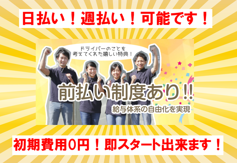 求めている人材 ◇必須要件◇ *普通運転免許(AT限定可) ◇歓迎要件◇ *軽貨物ドライバーの経験者 *軽チャータードライバー経験者 *運送・配送業者でのドライバー経験者 *運送・配送業者でのセールスドライバー経験者 *タクシー、バス等の運転手のご経験 *ハイヤー運転手の経験者 *大型バンドライバーの経験者 *送迎ドライバーの経験者 *ピザデリバリーのご経験者 *宅配寿司のご経験者 *新聞配達のご経験者 *未経験歓迎 *週5〜6回勤務できる方 *長期間勤務できる方 *学歴・経験・年齢不問 *フリーターの方 *IターンUターンをお考えの方 <未経験でも安心> 弊社は独自の研修カリキュラムがある為、 未経験でも安心して働けます!! 軽い荷物が多いため女性スタッフも多数活躍中!
