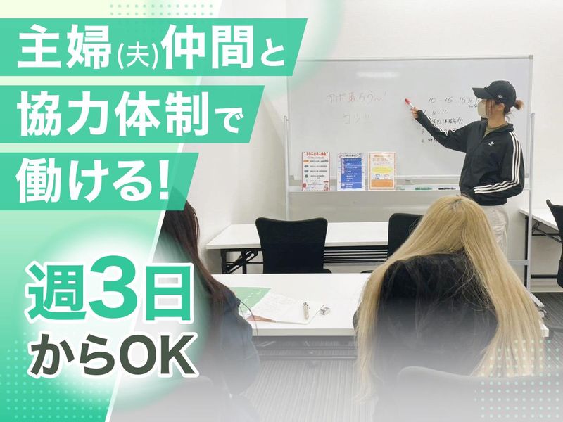 勤務時間詳細 ⏰9:00~18:00 ⭐週3日~OK! ⭐1日3時間~OK! ⌚休憩スタイル選べます!  ̄ ̄ ̄ ̄ ̄ ̄ ̄ ̄ ̄ ̄ ̄ ̄ ̄ ̄ 「集中して短時間で働きたい」も 「しっかり休憩をとりながら 長めに働きたい」もどちらもOK! 以下のように、勤務スタイルに 応じて休憩の取り方を選べます。 ▼お昼休憩なし(計70分/7時間50分勤務)  ̄ ̄ ̄ ̄ ̄ ̄ ̄ ̄ ̄ ̄ ̄ ̄ ̄ ̄ ̄ ̄ ̄ ̄ ̄ 10:20~10:30 12:00~12:10 13:00~13:10 14:00~14:10 15:00~15:10 16:00~16:10 17:00~17:10 ▼お昼休憩あり(計120分/7時間10分勤務)  ̄ ̄ ̄ ̄ ̄ ̄ ̄ ̄ ̄ ̄ ̄ ̄ ̄ ̄ ̄ ̄ ̄ ̄ ̄ 10:20~10:30 12:00~13:00(昼休憩) 13:00~13:10 14:00~14:10 15:00~15:10 16:00~16:10 17:00~17:10 どちらも選択可能なので、 自分の集中力や働き方に合わせて 調整できます! 「短時間で効率よく」 「ゆとりを持って1日しっかり」 …あなたらしい働き方を応援します♪