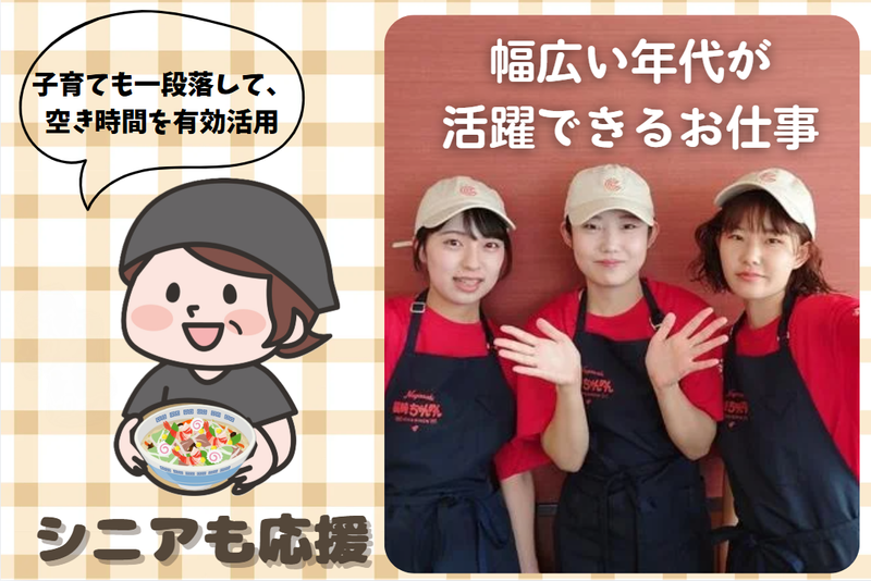 仕事内容 接客・レジ・キッチンのお仕事です。 未経験から始めた仲間ばかり! タッチパネル式でどなたでも簡単に 覚えられるので安心してくださいね! キッチンはマニュアルに沿った 簡単な作業だから、どなたでもすぐに 慣れて頂けますのでご安心下さい。 学校やWワークなど諸事情で 「キッチンしか入れない」 逆に「手があれやすいからホールだけで」 なんて方も柔軟に対応します◎ 気さくで優しい仲間ばかりで、 毎日わいわい楽しく働いています。 1日3H~の超時短勤務もOK 週1~OK! スケジュールも立てやすい! 学校行事や、試験休み、 お子さんの急な体調不良など、 何でも相談してくださいね。 期間の相談もお気軽に! その後のシフトも相談OK