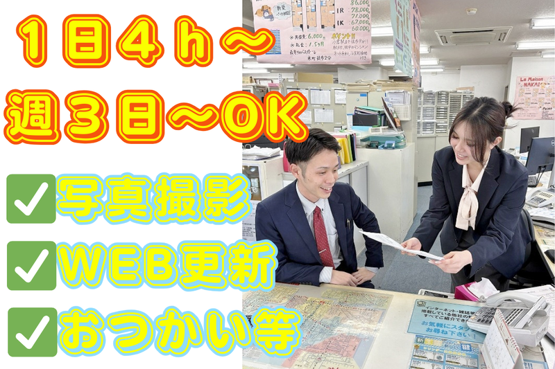 仕事内容 ⭐===============⭐ 写真を撮ってサイトにアップ! 事務×外出業務のいいとこ取りで 飽きずにたのしみながら働けます♪ 週3日~土日祝も勤務できる方ぜひ✨ ⭐===============⭐ 集中できる事務作業と、気分転換にもなる外出業務(写真撮影や空き部屋の内寸)で、バランスよく働けます♪全国のお客様へ、最新のお部屋情報をWEB上でお届けするお仕事です! ✅写真撮影 社用車を使用して現地へ向かい、不動産物件の外観や内観を撮影します。撮影に関する特別はスキルは必要ありません♪ 移動は軽自動車またはコンパクトカーなので運転しやすいですよ◎ ✅物件情報の更新 撮影した写真や間取り図、オーナー様からの更新メールを元に、WEB・広告の情報を更新します。自分がお部屋探しをする気持ちになって「見やすい・わかりやすい」を大切に! ポイントやおすすめ個所のコメント登録など、より具体的なイメージを伝えられる情報発信を目指しましょう✨決まったシステムへの入力作業なので、タイピングなどのPC基本操作ができればOK! ✅現場作業 内寸(採寸)や撮影に付随する事務作業など、現地での細かい業務もあります。 入社後はWEB課のスタッフが、物件撮影や更新業務の流れを一つひとつ丁寧に教えます!「事務職が初めて」「不動産業界の知識がない」そんな未経験の方も、安心してご応募くださいね♪業務に慣れて「もっと稼ぎたい」という方は、職種は異なりますが、適正に応じて「お部屋探しのアドバイザー」として正社員登用も可能です! □■1週間の流れ(例)■□ 【月曜】物件撮影に出発! 【火曜】写真の色味・角度調整、アップロード作業 【水曜】新着情報をいち早くサイトへ公開♪ 【木曜】店休日 【金曜】撮影 or 更新 orサポート 【土日】営業チームの事務サポートなど ※上記はあくまで一例です。 出社時にその日の業務が決まるため毎日新鮮に働けます✨ □■AIによるオススメpoint■□ ✨事務と外出の“良いバランス”で、ずっとデスクワークは飽きる…という方にもぴったり◎ ✨“間違い探しが得意”な方や“ゲーム好きな方”にも向くチェック系作業あり★ ✨週3日〜、1日4時間〜OKなので、副業したい方やWワーカーさんも働きやすい! ✨家庭と両立したい主婦さん、子育て中のママさんも活躍中で、お休みの相談も気軽にできます♪ ✨社用車貸与&服装・髪型・ネイル自由で、気軽にスタートできる環境。 ✨地元に根ざした不動産会社で、安定感あり!内勤スキル+外勤の経験も積めます。 □■会社について■□ 地域密着の不動産会社として多数実績あり!物件撮影~WEB更新まで一貫して自社で行い、「お部屋探しをスムーズに、そして魅力的に見せる」ことを大切にしています。 スタッフは20代〜40代・主婦さんが中心で和やかな社風です。希望や適性に応じて職種転換での正社員登用制度もあります。まずは写真撮影・WEB更新のパートから始めて「お部屋探しのアドバイザー」へのステップアップも可能です。