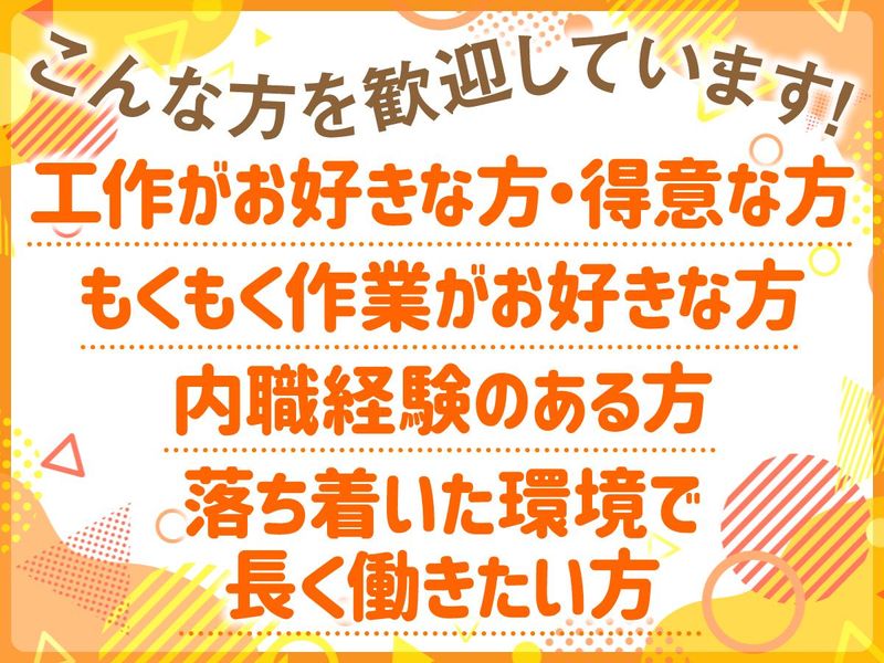 求めている人材 未経験の方大歓迎! 主婦・主夫歓迎! \こんな方も大歓迎しています!/ ◆工作がお好きな方・得意な方 ◆もくもく作業がお好きな方 ◆内職経験のある方 ◆ブランクのある方 ◆落ち着いた環境で長く働きたい方