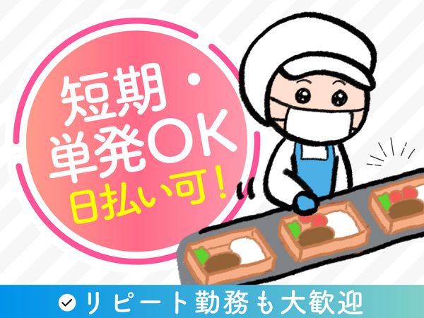 仕事内容 ==★<単発ok★大量募集中!>★== SNSなどでも今話題の有名企業です♪ 今回お任せしたいお仕事は・・・・ 流れてくるお弁当に食材を盛付け 異物が入っていないかの検品・梱包♪ <こんな方にオススメのお仕事です★> ・人見知りで接客のお仕事が苦手で・・ ・コツコツ何も考えずにする作業が得意 ◆===========◆ コツコツ・黙々のお仕事 会話は少なめで気楽♪ ◆===========◆ お仕事内容はお弁当の盛り付け 見本と同じ場所に、決められた分量を 盛り付けていくので、 高度な技術は必要ありません! マニュアル有りで安心◎ ◆============◆ 「お友達と一緒に応募」もOK! ◆============◆ 友達に誘われて一緒に応募しました! 皆すごく親切で、わからないことや 困っているとすぐに声をかけてくれて 助かりました! ◆===========◆ すぐに覚えられるお仕事 ◆===========◆ コツコツ・モクモク・自分のペースを 崩さず仕事をしたいと考えている方に ピッタリの軽作業のお仕事★ 作業の流れは一度覚えてしまえば簡単です♪