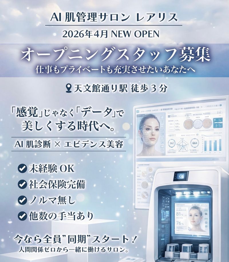 アピールポイント: 時間にも、収入にも、余裕のある毎日を。仕事もプライベートも充実させたいあなたへ。 4月OPEN|オープニングスタッフ募集 全員が同じスタート。 派閥・上下関係ゼロ。 立ち上げメンバーとしてサロンづくりに関われます。 〜AI肌分析導入サロン〜 感覚ではなく、データに基づくカウンセリング。 未経験の方でも“根拠をもって提案できる”環境です。 〜頑張りがきちんと評価される〜 正社員 最低保証22万円〜 将来月収38万円も可能。 〜ノルマなし〜 無理な押し売りはしません。 お客様に寄り添う“提案型接客”を大切にしています。 〜働きやすい環境づくり〜 シフトは月2回作成。 休み希望もできる限り考慮します。 残業ほぼなし。 〜豊富なバック制度〜 売上だけでなく、さまざまな項目でインセンティブをご用意。 頑張り方はひとつではありません。 あなたの得意を活かしてしっかり収入アップを目指せます。