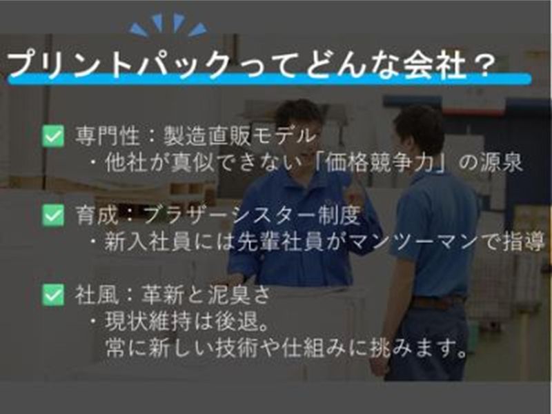 仕事内容 ✨この求人のポイント✨ ✅ 印刷通販売上・満足度No.1 業界リーダー企業で挑戦できる ✅ 内製化率99%の自社一貫体制 ものづくりの全工程を俯瞰できる ✅ 「安さは社会貢献」という信念 誠実なビジネスで感謝される喜び ✅ 未来のリーダー候補としての採用 若手のうちから裁量を持って働ける ✨ 株式会社プリントパックについて ✨ 「ネットで印刷〜♪」のCMで おなじみの業界最大手企業です。 2002年の開始以来、業界の常識を 覆す低価格と高品質を追求。 累計255万名を超えるお客様に 支持されるリーディングカンパニー として成長を続けています。 創業から半世紀、印刷を通じて 「誰もが手軽に印刷物を発注できる世の中」で 「日本を元気に、世の中を幸せに」 することを目指しています。 ✨ 仕事の魅力 ✨ 上場企業から個人の方まで、 多様なお客様の挑戦を支える 社会貢献度の高い仕事です。 営業職を置かない独自のモデル。 あなたの緻密な計画や改善案が ビジネスの成果に直結します。 ✨ 働く環境 ✨ 住宅手当(月3万円)や 奨学金返済支援手当など、 生活を支える福利厚生が充実。 安心して成長できる環境です。 ✨ 応募歓迎メッセージ ✨ 現状に満足せず、変化を楽しみ 挑戦し続ける人を求めています。 お客様の「ありがとう」のために ひたむきに努力できるあなた。 次の50年を創る仲間として お会いできるのを楽しみにしています。 ✨ 説明会案内 ✨ ✅ 参加方法 ➀ まずは応募画面から応募 ➁ マイページのアカウント案内 メールが届きます ➂ マイページより希望日程を ご予約ください ✨ 向いている人 ✨ ✅ できない理由よりできる方法を 考えられる方 ✅ 緻密な計画を立てて、 コツコツと最後までやり遂げたい方 ✅ 業界を変えるような 大きな目標達成に燃えたい方 ✅ チームの信頼関係を 何よりも大切にしたい方 ※配属地について 初回配属地は本社(京都)配属になります。 【他勤務地候補】 札幌 群馬 埼玉 千葉 東京 福岡